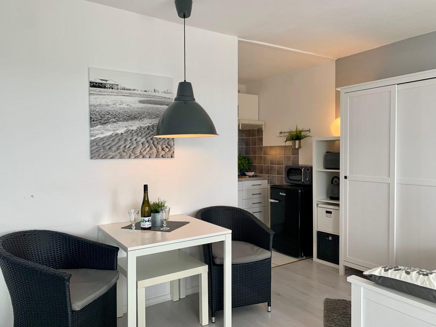 Modernes 1-Zimmer Apartment in St. Peter Ording mit Balkon und seitlichem Meerblick, nur 300 m vom Strand entfernt.