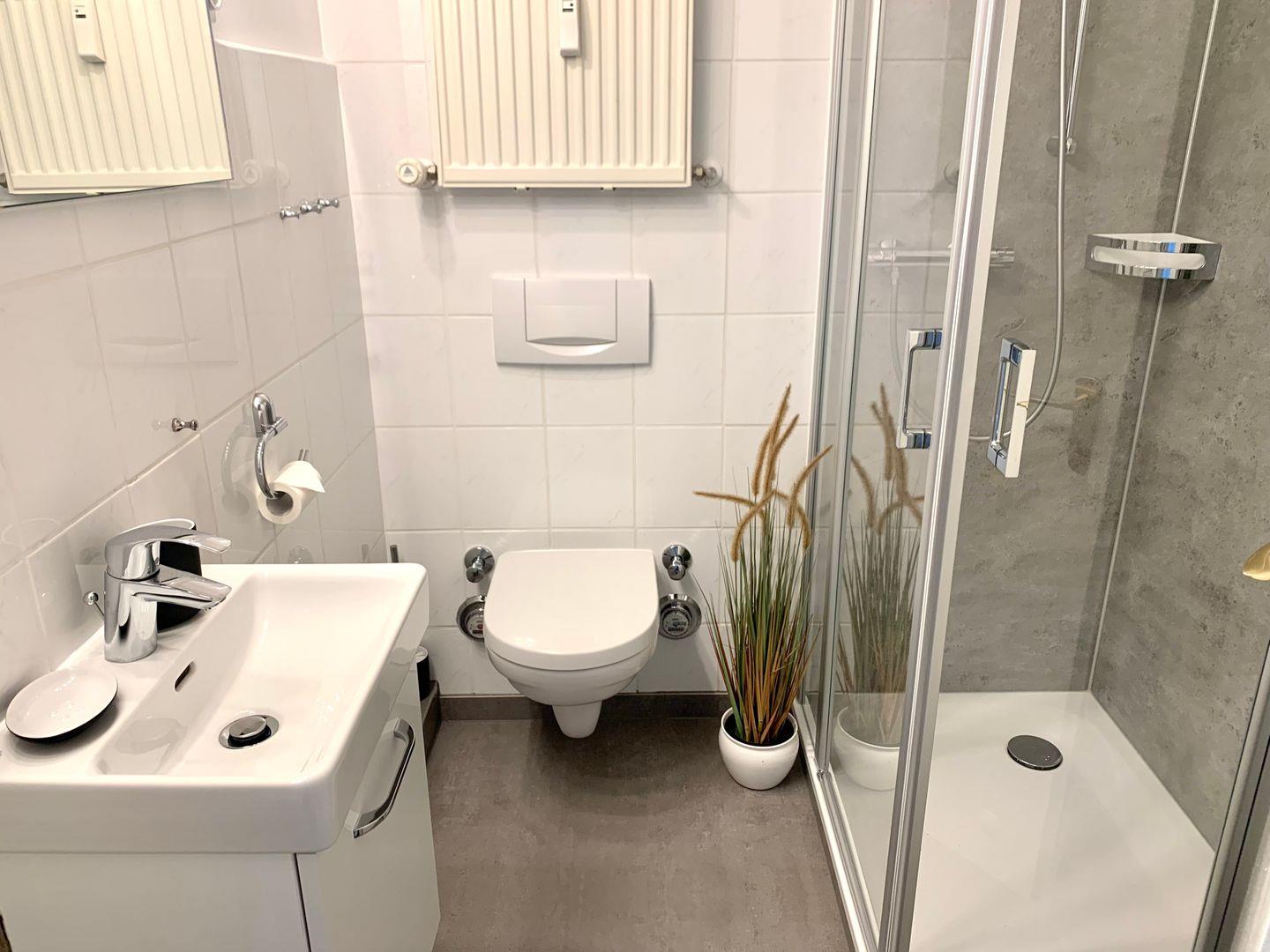 Das moderne Duschbad mit WC verfügt über einen sehr niedriger Duscheinstieg und ist unter anderem mit einem Haartrockner ausgestattet.
