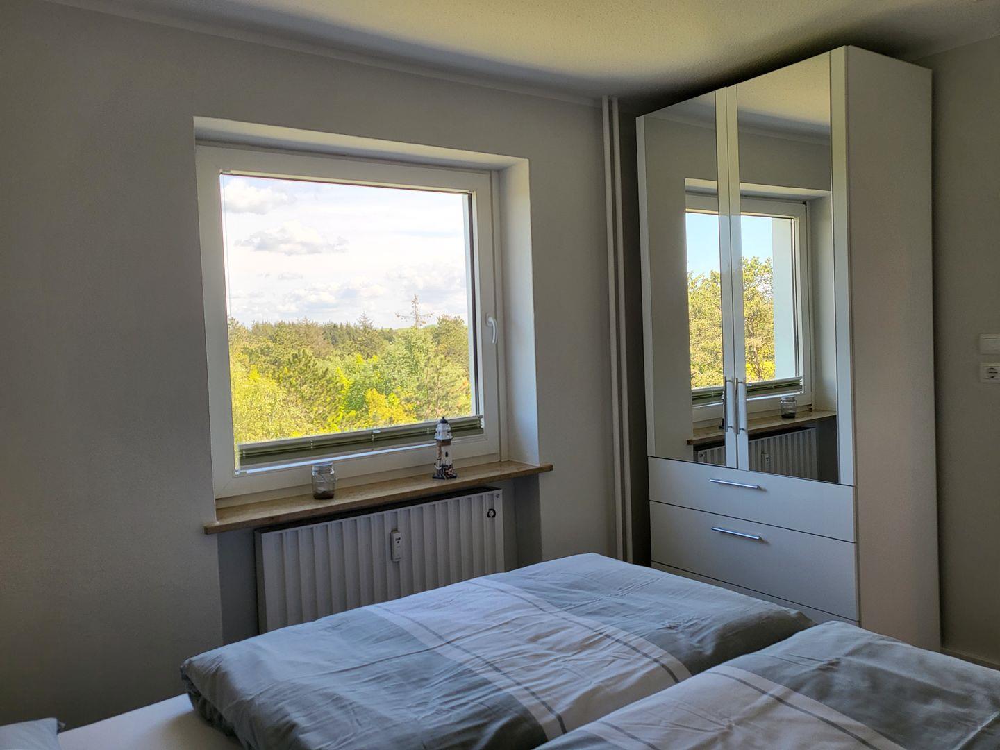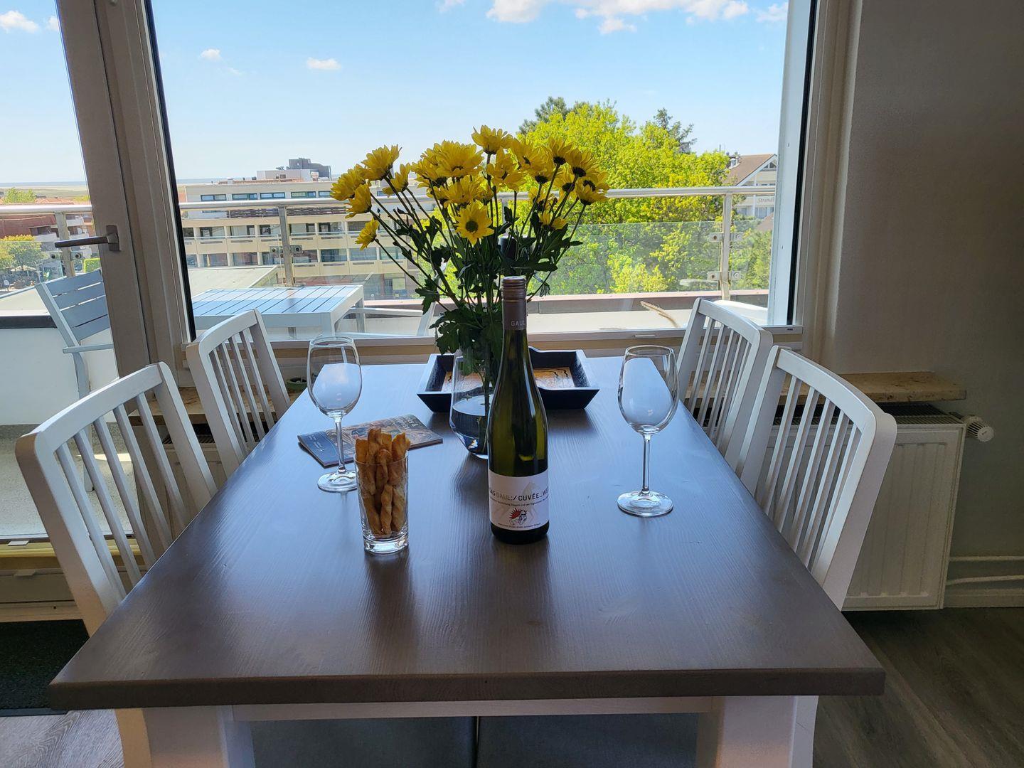 Die zentral gelegene Ferienwohnung begeistert mit direktem Meerblick vom Balkon und kurzen Wegen zum Beispiel zum Strand und zur Dünentherme.