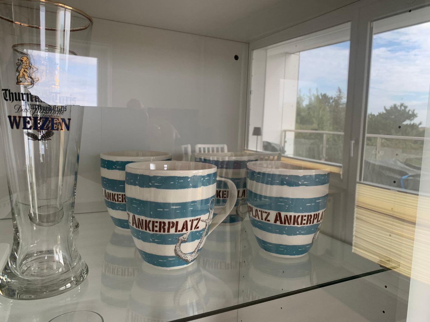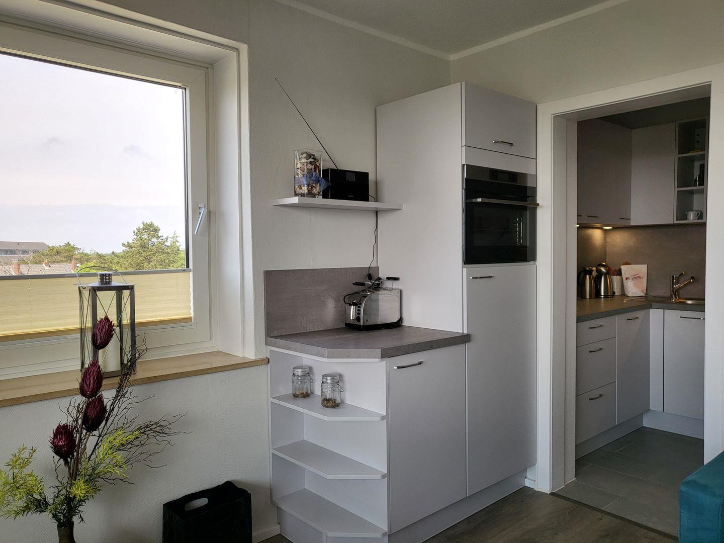 Unter anderem stehen hier Cerankochfeld und Backofen zur Verfügung, ein Kühlschrank mit Gefrierfach, eine Mikrowelle sowie Wasserkocher und Kaffeemaschine stehen ebenfalls bereit.