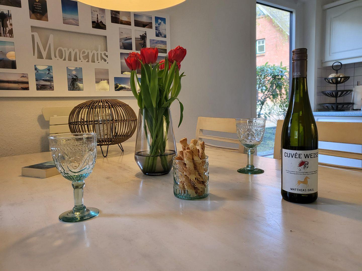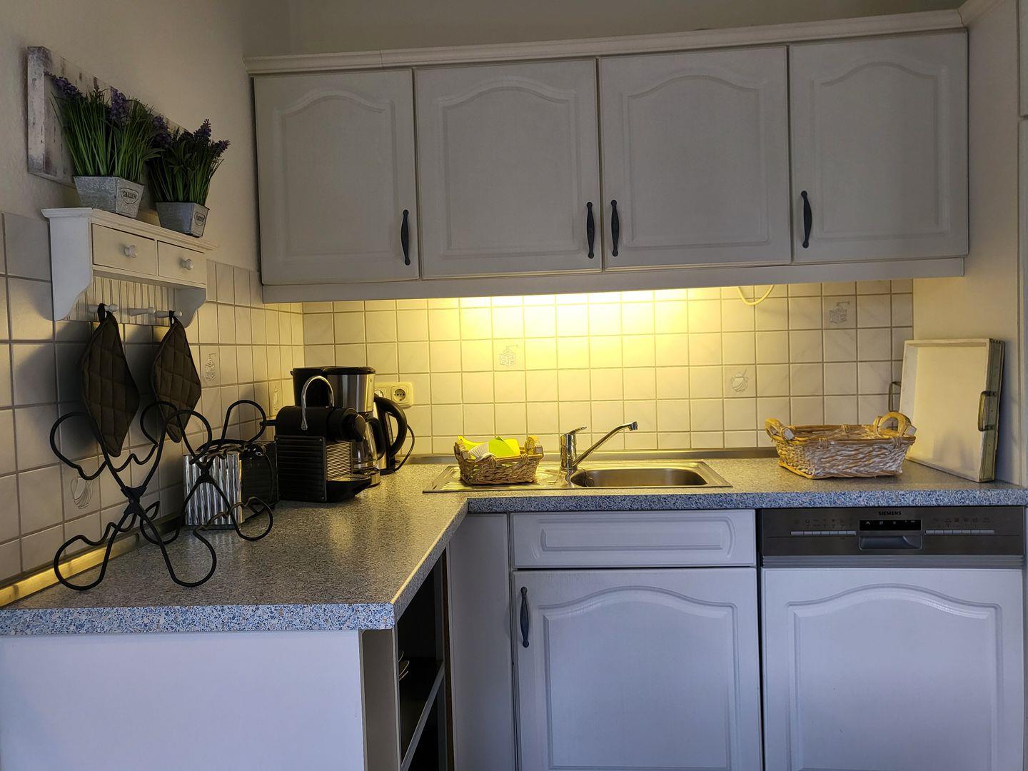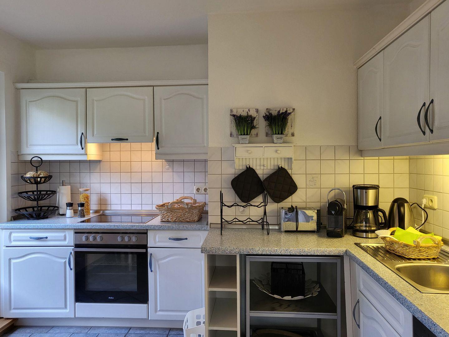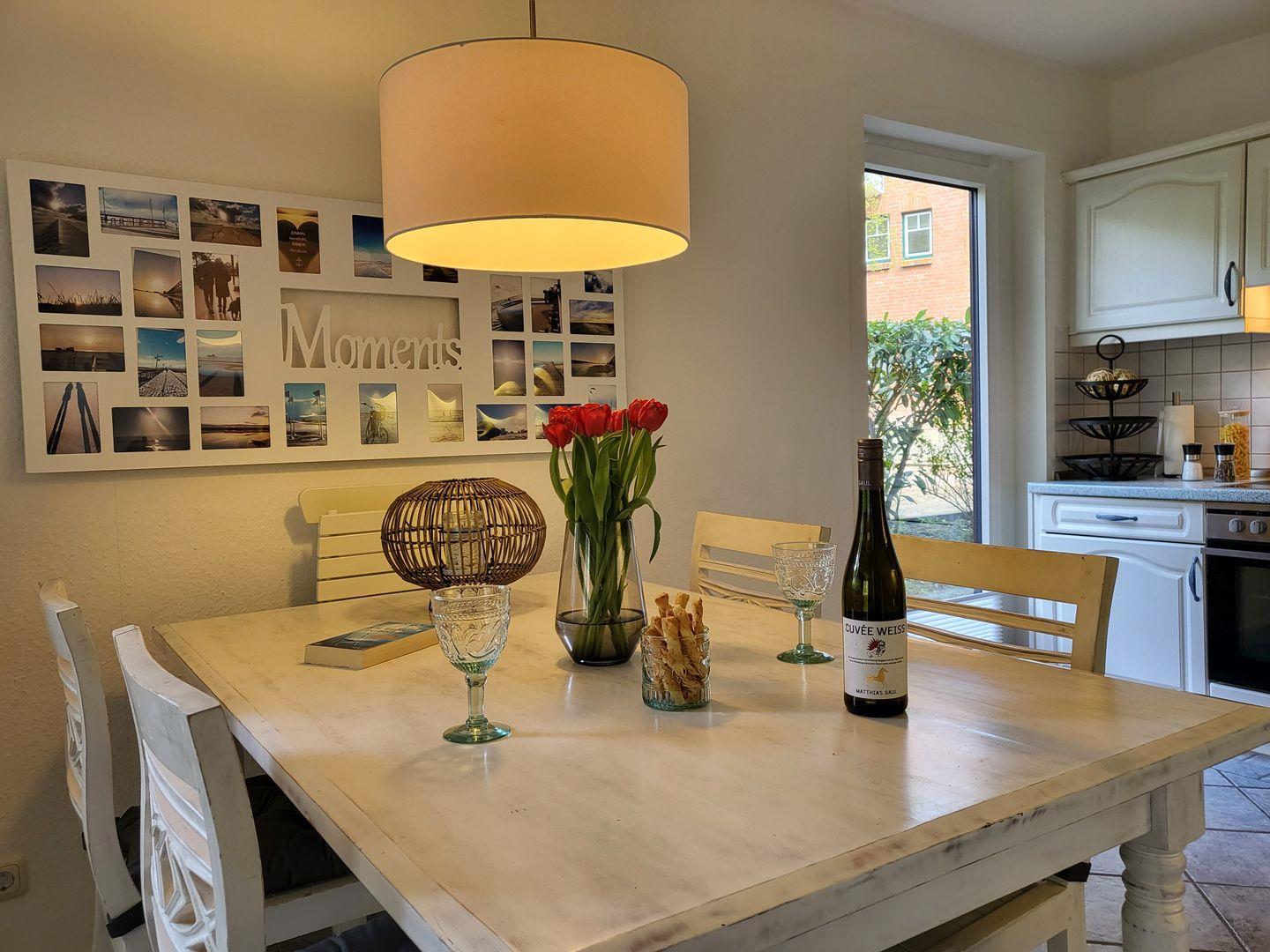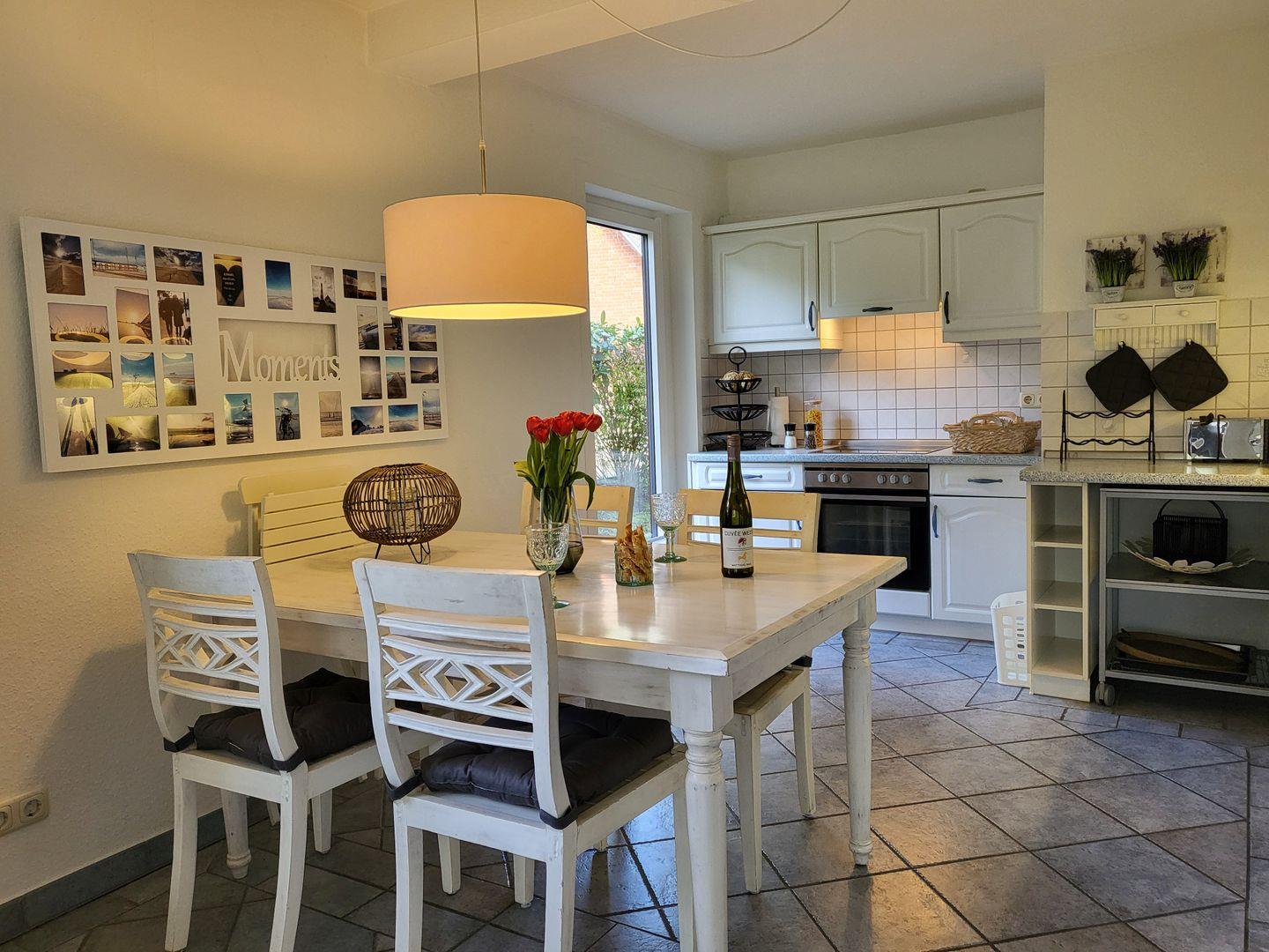 Angrenzend liegt der großzügige Essbereich und die offene Küche der Ferienwohnung, zu deren Ausstattung unter anderem Cerankochfeld und Backofen, Kühlschrank mit Gefrierfach sowie Geschirrspüler und Kaffeemaschine gehören.