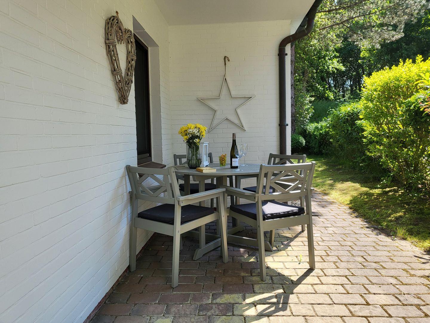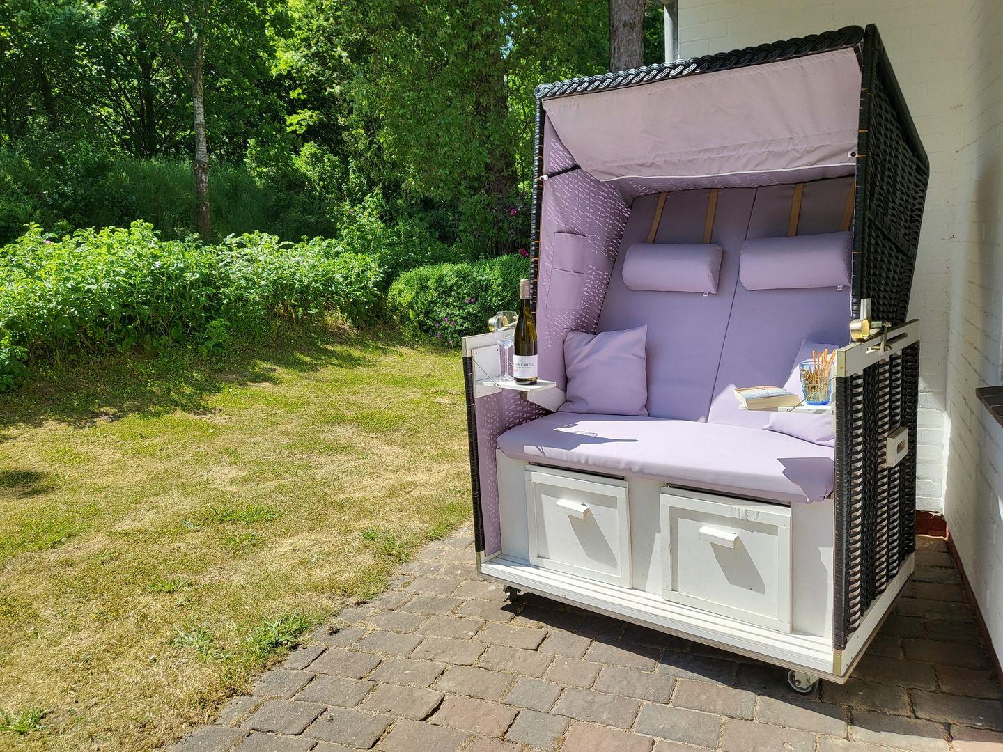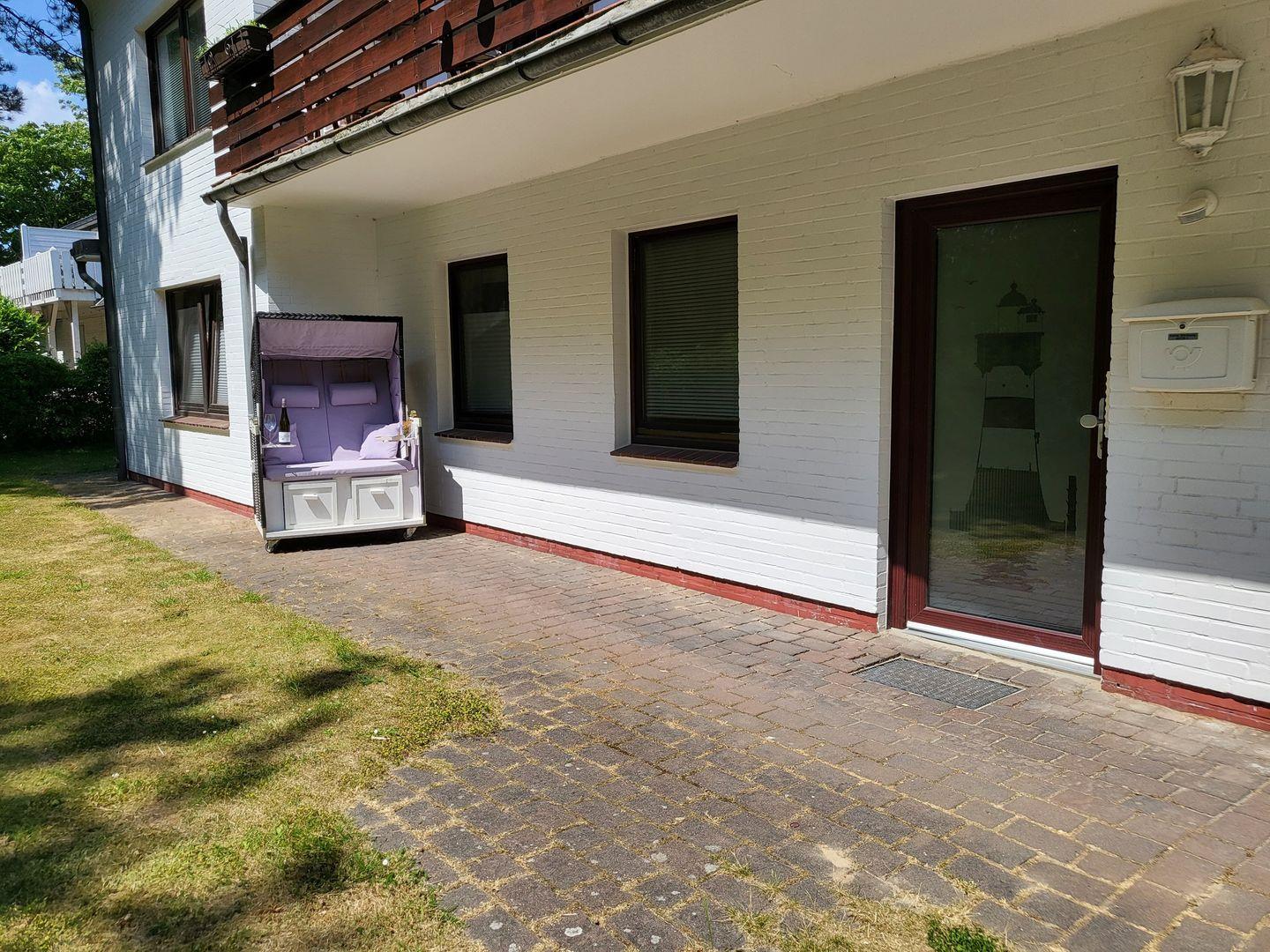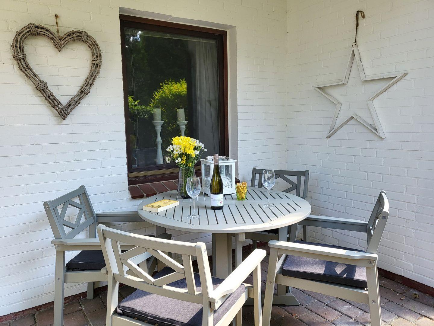 Zur Ferienwohnung gehört eine möblierte Terrasse, in den Sommermonaten steht hier ein typisch norddeutscher Strandkorb zur Verfügung.