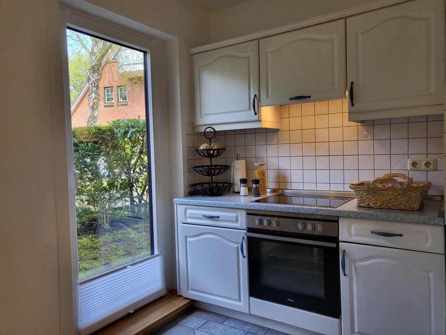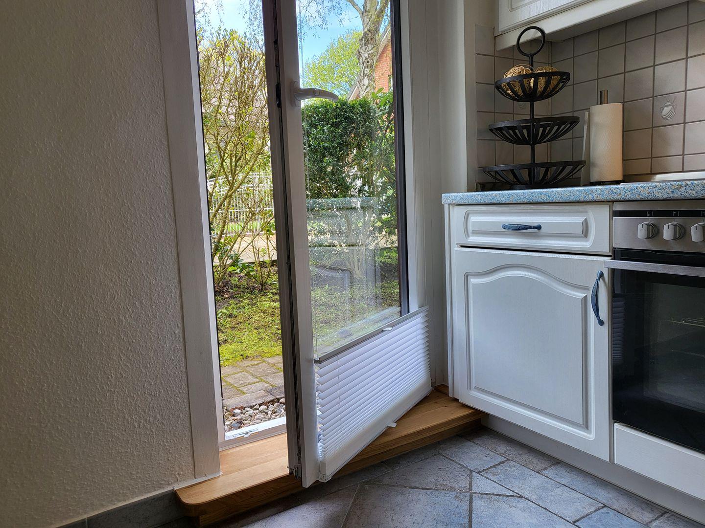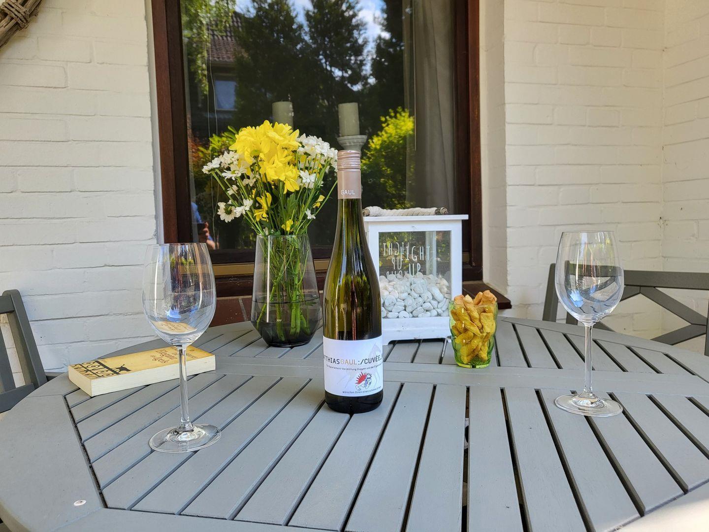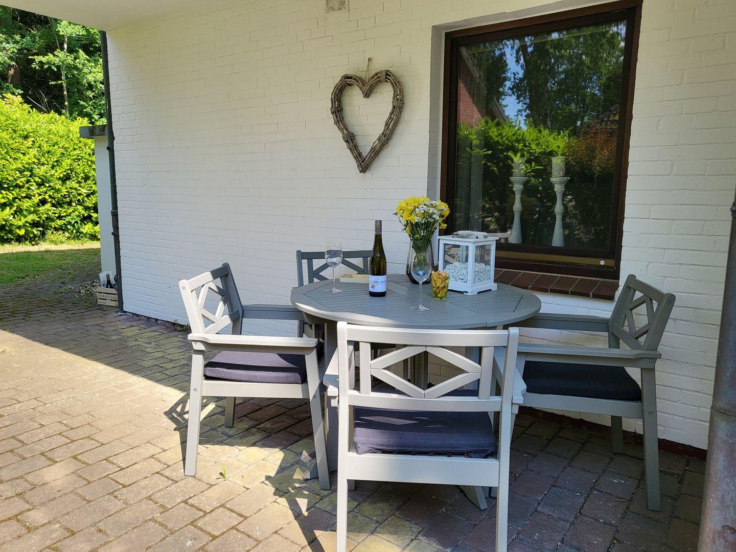 Zur Ferienwohnung gehört eine möblierte Terrasse, in den Sommermonaten steht hier ein typisch norddeutscher Strandkorb zur Verfügung.