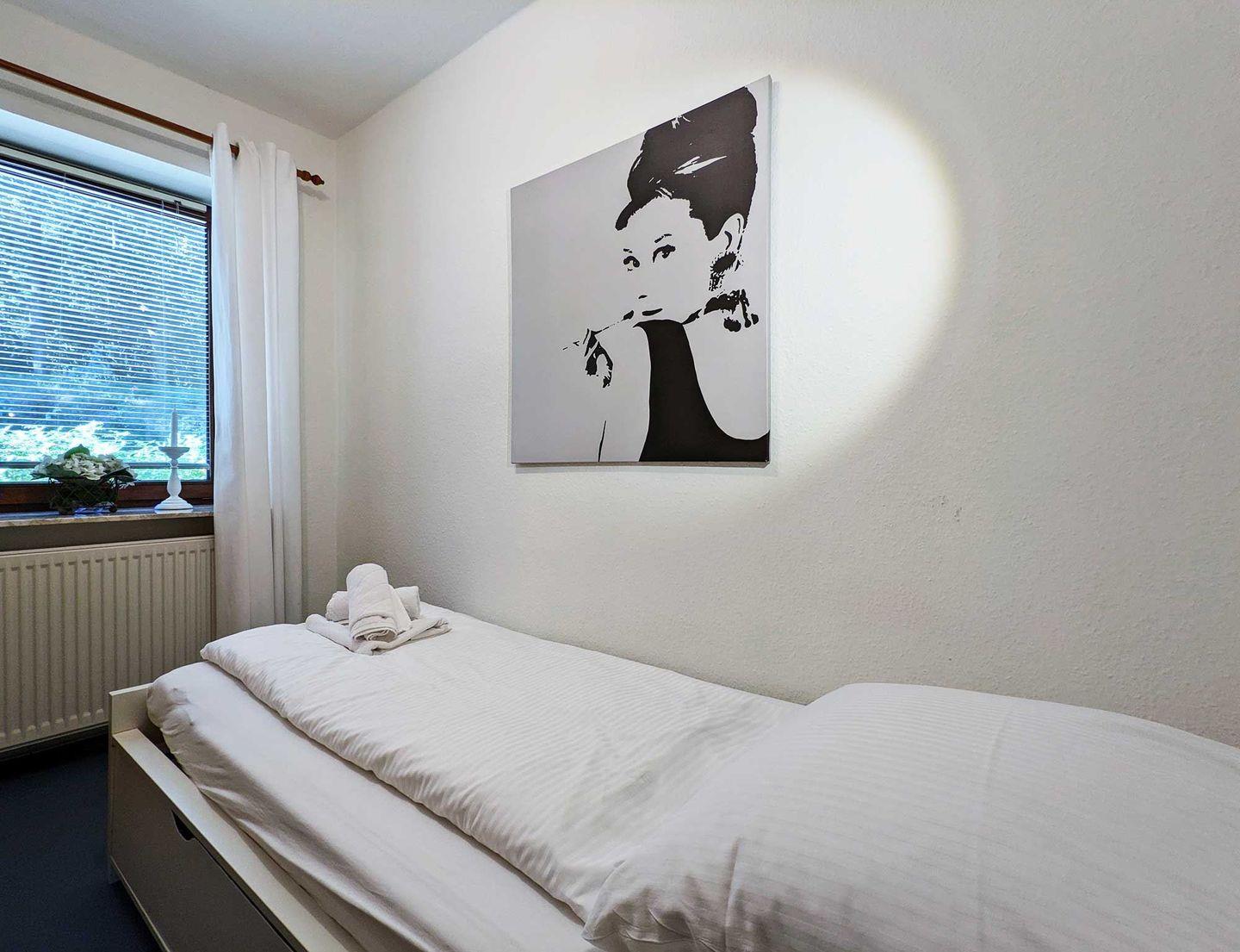Die Schlafmöglichkeiten verteilen sich auf drei Schlafzimmer. Eines ist ausgestattet mit 180x200cm Doppelbett, in einem weiteren steht ein Einzelbett zur Verfügung.
