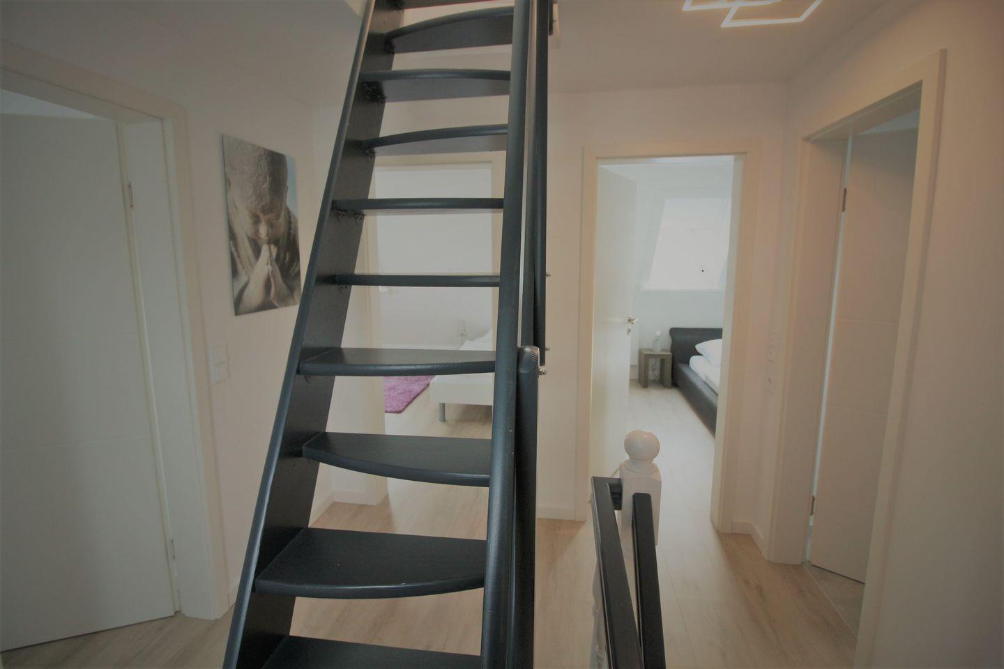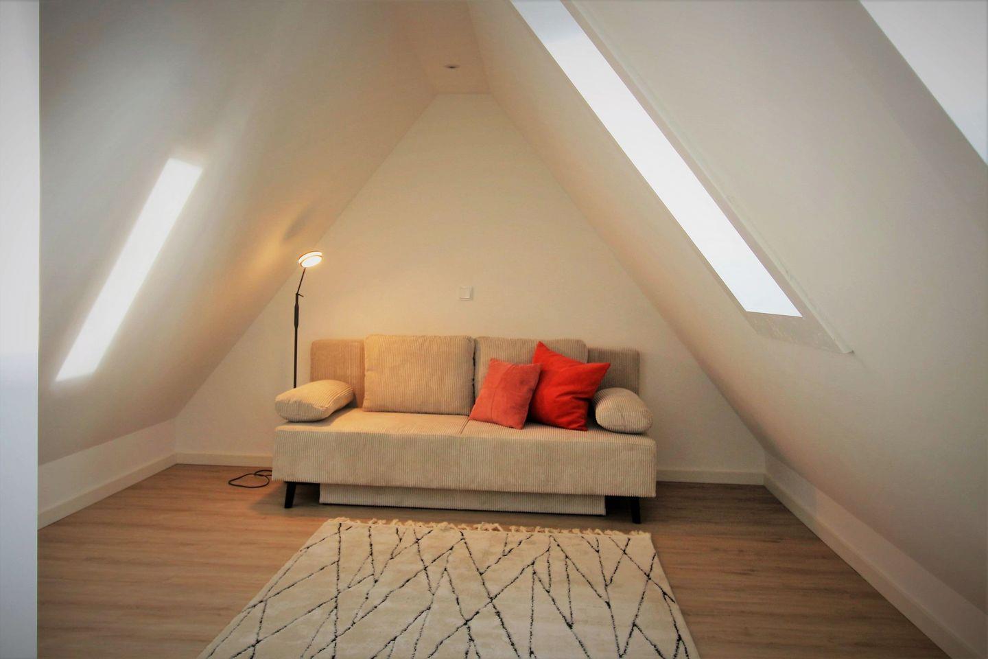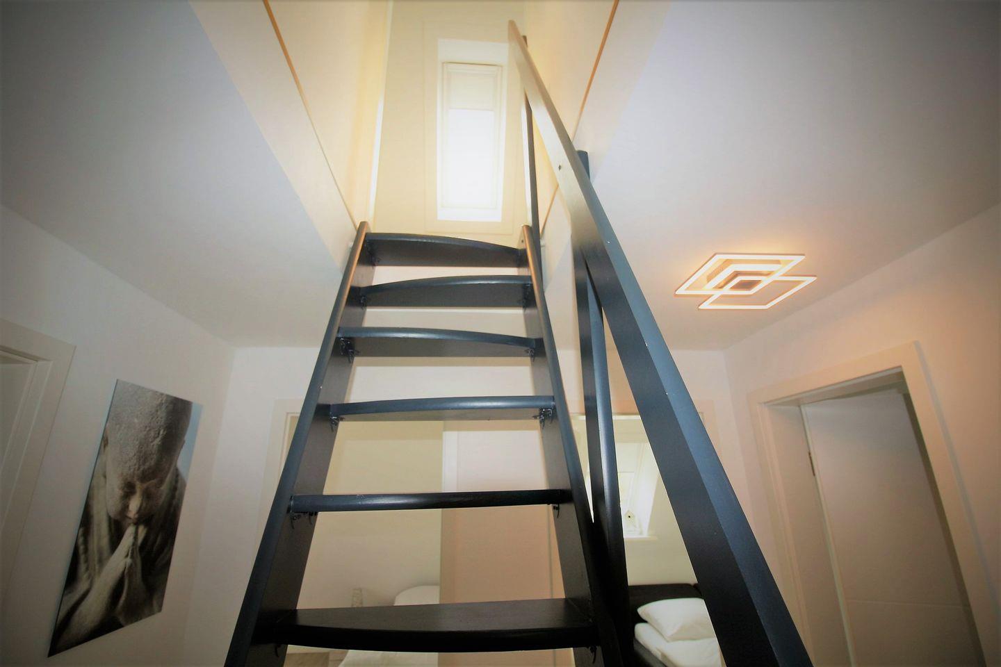 Im Dachgeschoß, die Treppe ist etwas steiler, ist ein weiteres Schlafzimmer mit 160x200cm Doppelbett und TV, sowie ein Aufenthaltsraum mit Sofa als Rückzugsort zum Lesen.