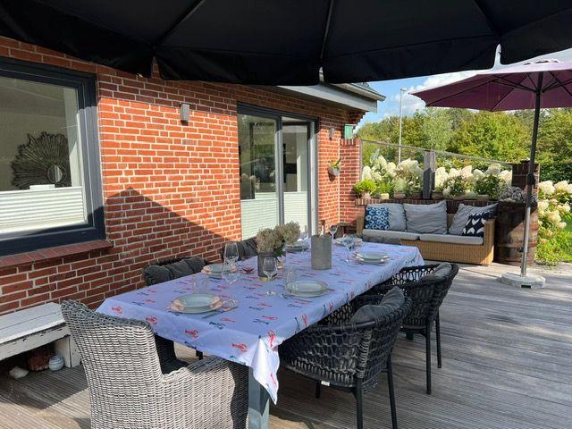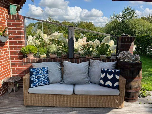 Die Terrasse bietet Tisch und Stühle und ein Gartensofa.