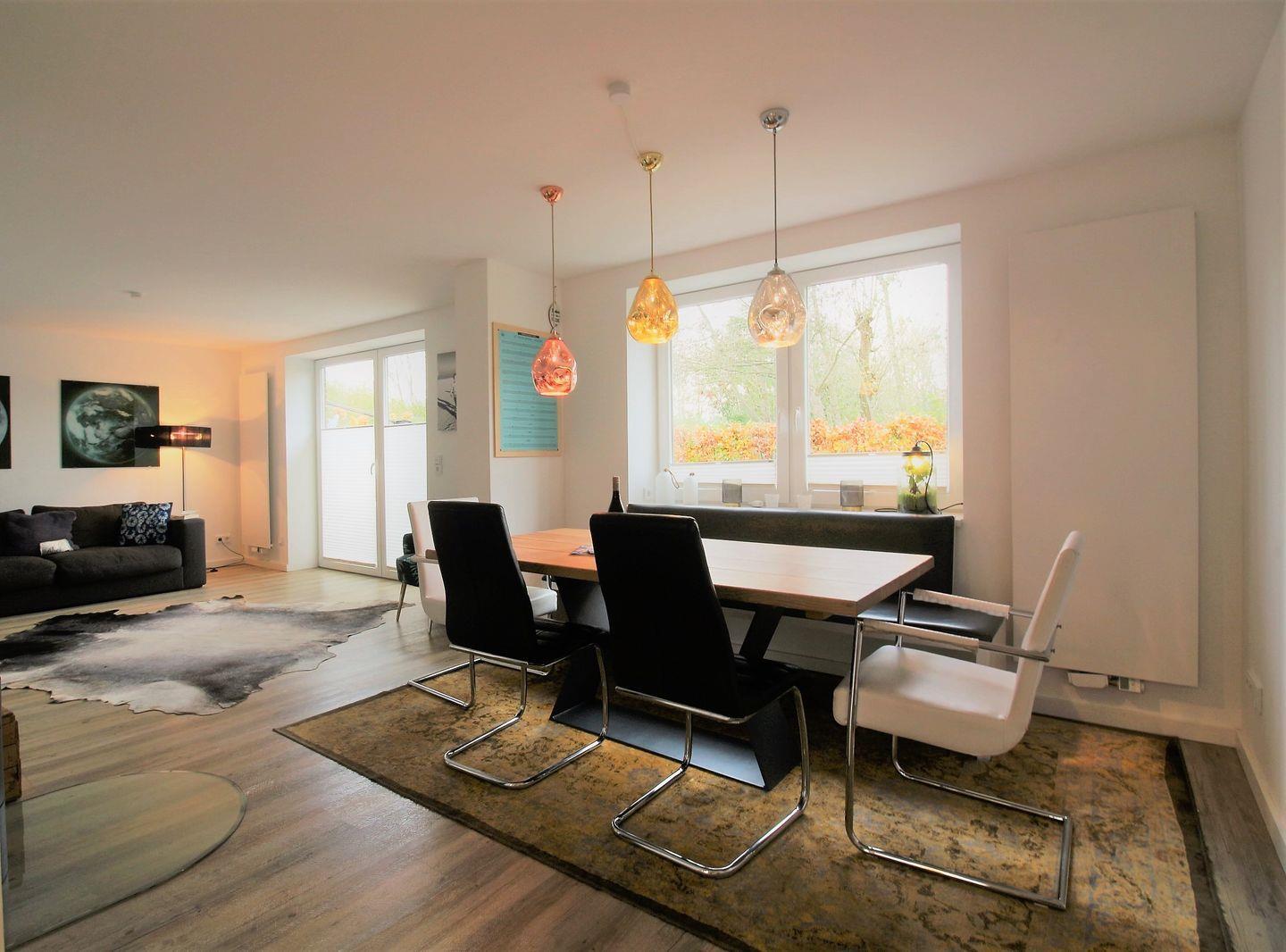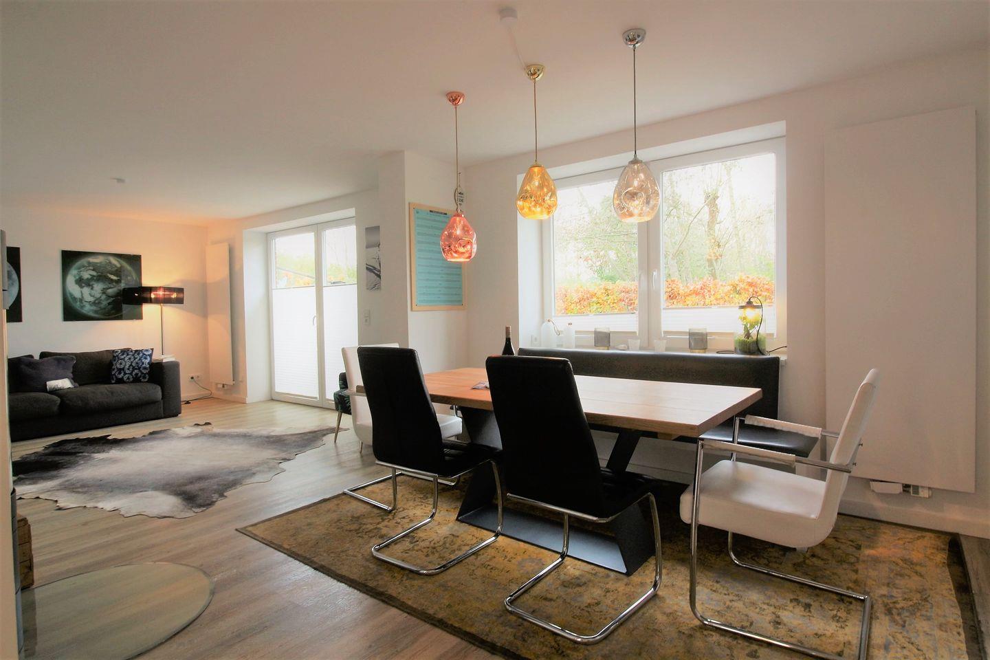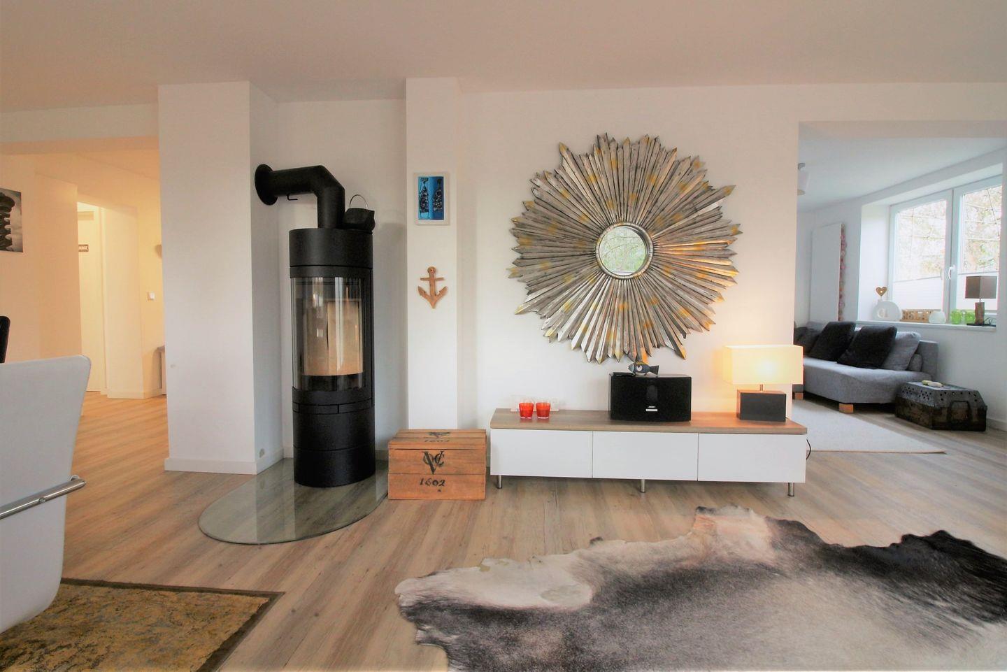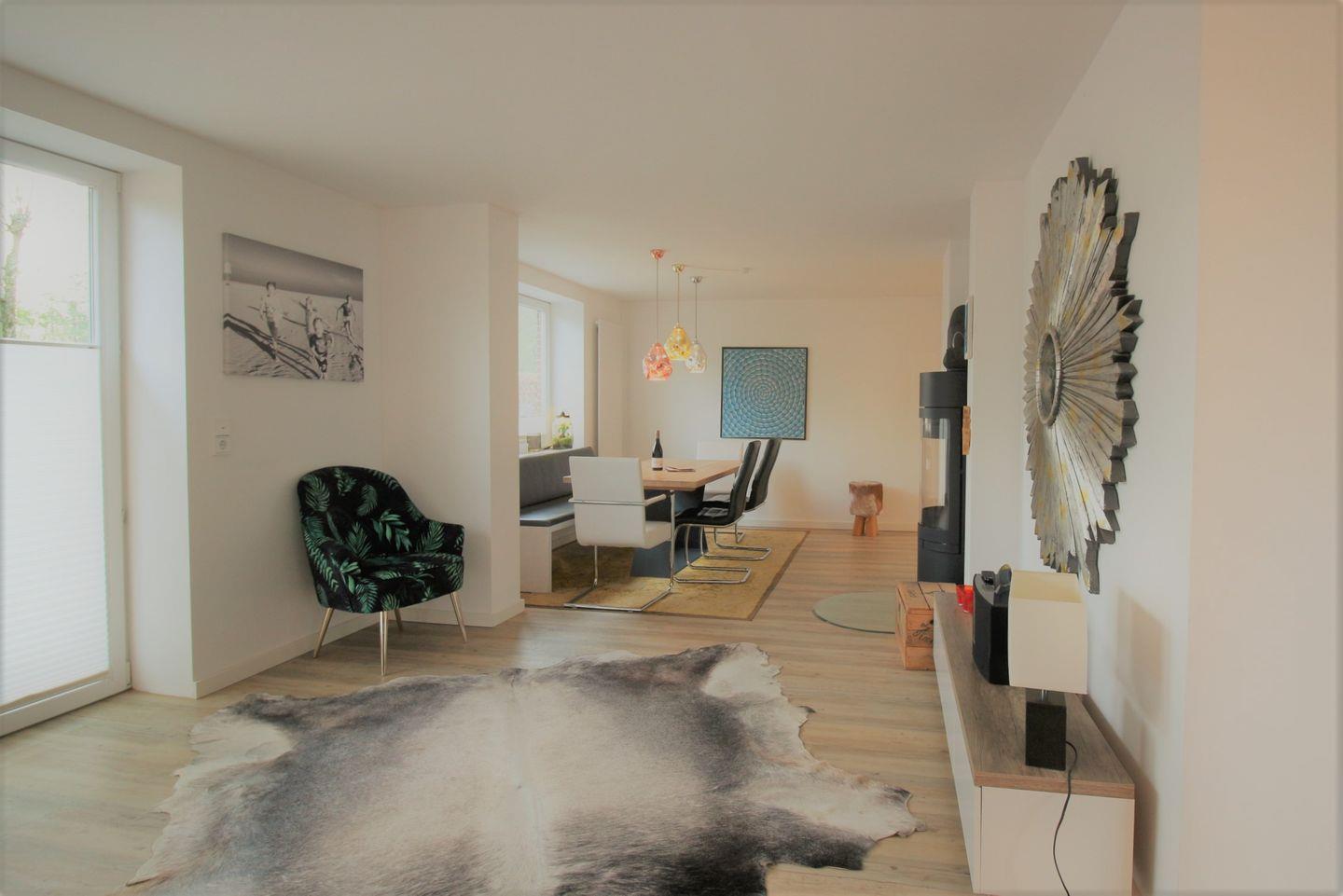 Im Erdgeschoß gibt es einen Flur mit Garderobe, Gäste-WC, eine schöne und gut ausgestattete Küche mit Zugang zum großzügigen Ess-Wohnbereich mit Kaminofen.