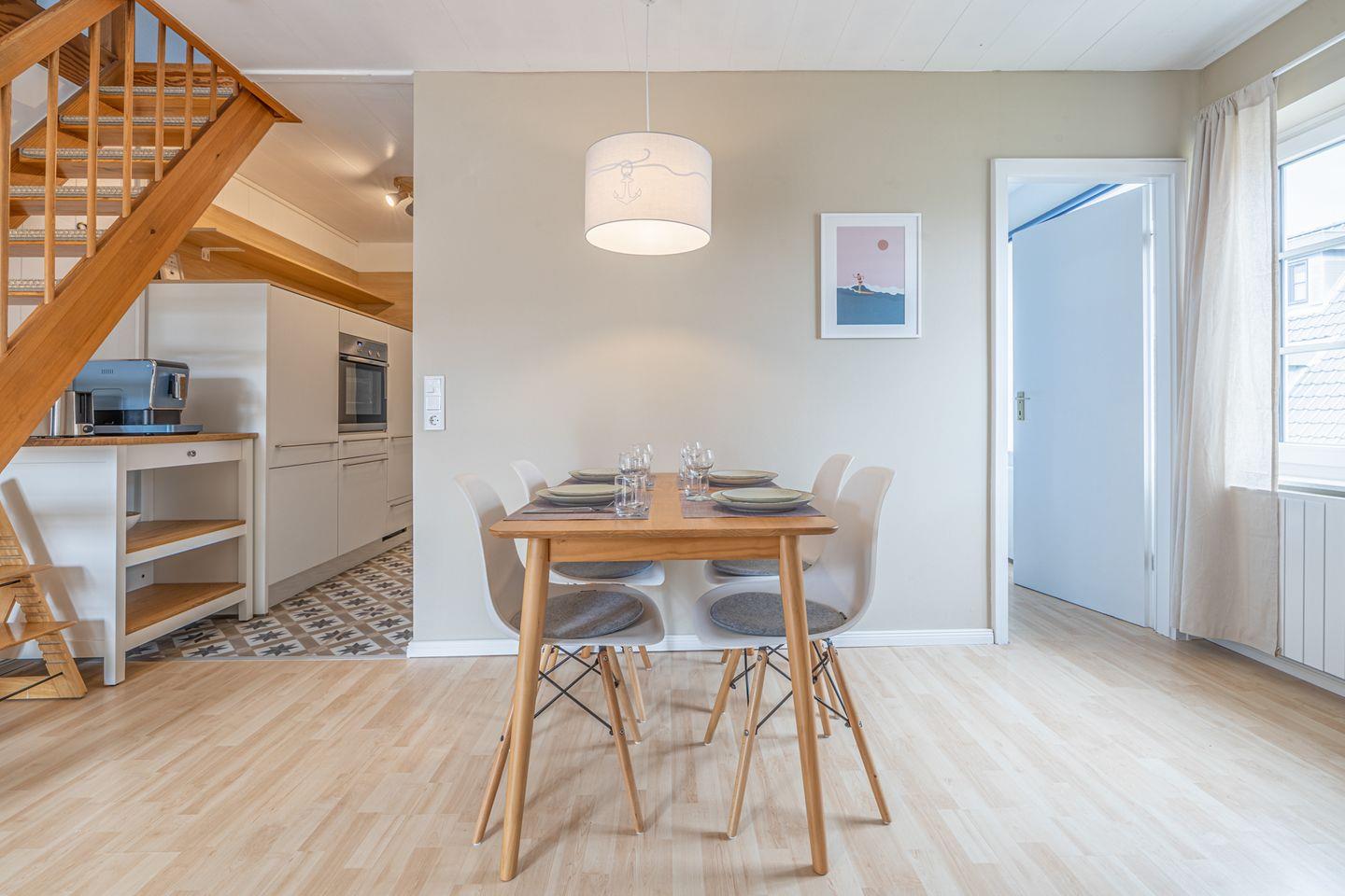 Die 60 qm große Ferienwohnung eignet sich für bis zu 4 Personen. Die in 2022 komplett renovierte und modern eingerichtete Ferienwohnung lädt Sie mit einem gemütlichen Wohnraum und Essbereich zum Beisammensein ein. Die umfangreich und komfortabel ausgestattetete Küche bietet eine Geschirrspülmaschine, Ceranfeld, Backofen, Kühlschrank, Toaster, Mikrowelle, Kaffeevollautomat von Tchibo (Bohnen) und Wasserkocher.