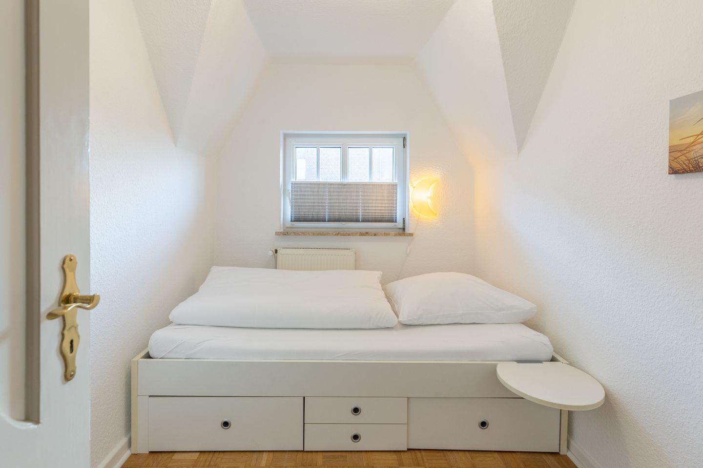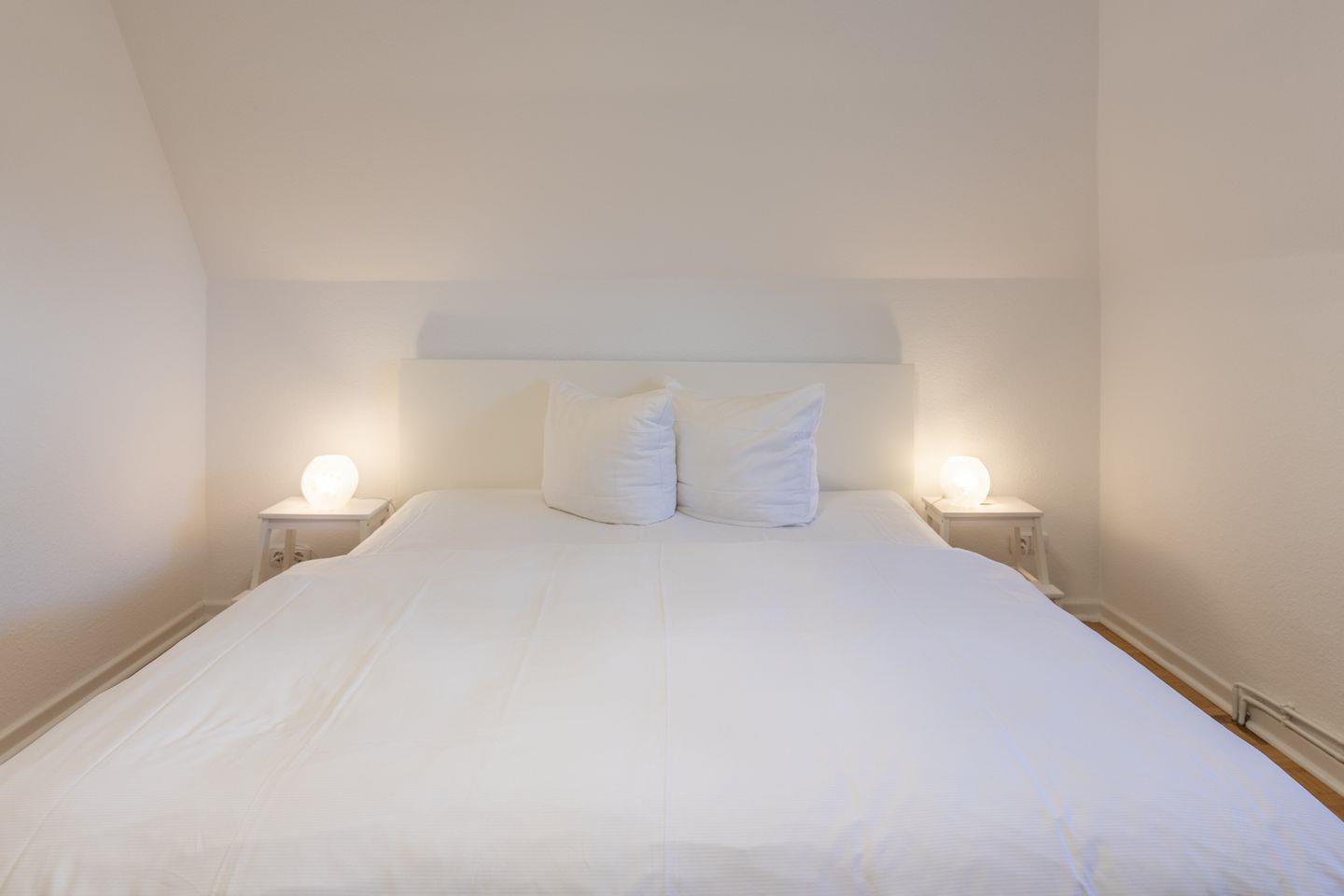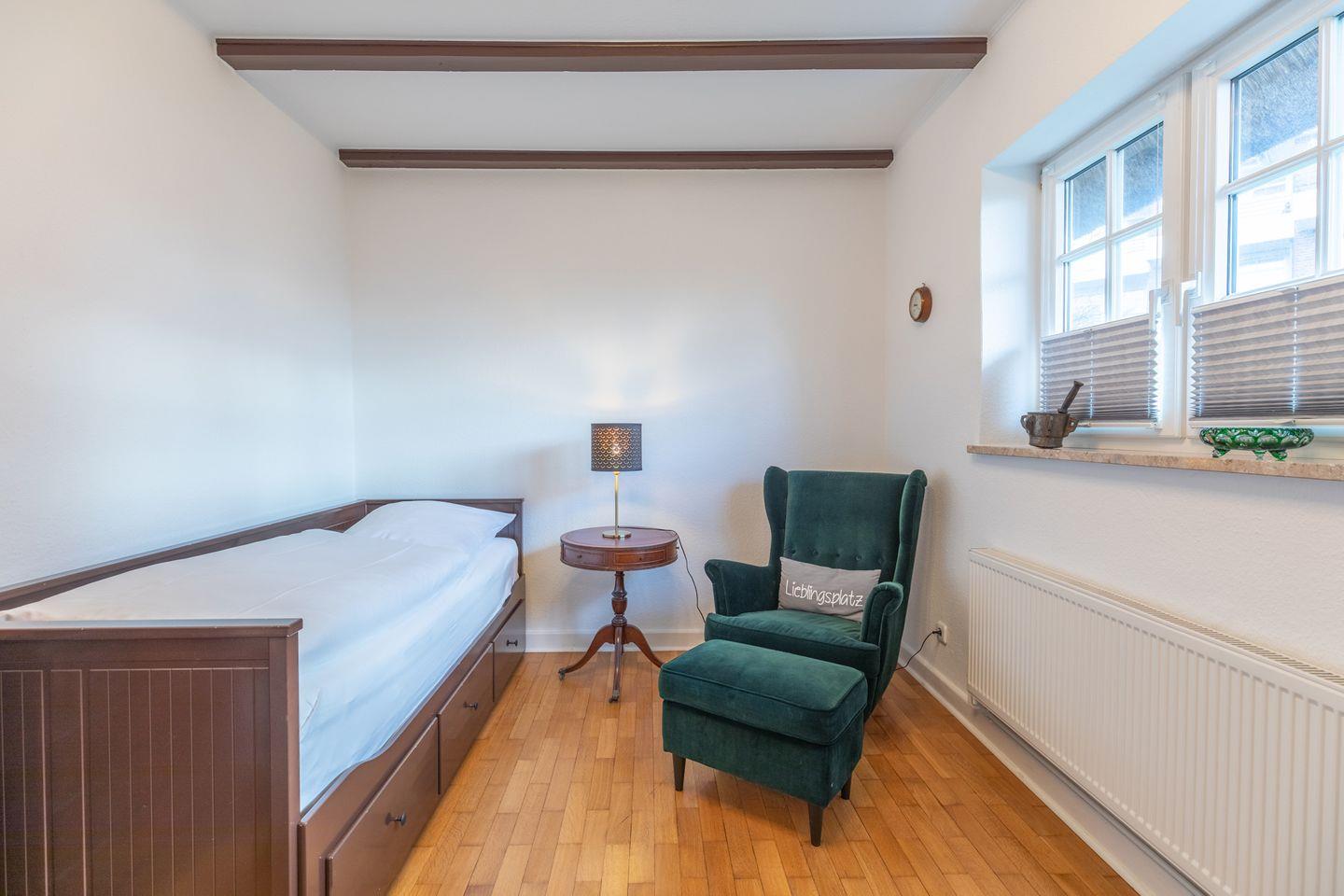 Das Ferienhaus verfügt über vier Schlafzimmer: eines im Erdgeschoss mit einem ausziehbaren Kojenbett, die anderen drei sind über eine Treppe (recht steile, geschlossene Holztreppe) im Obergeschoss erreichbar. Die Betten (180x 200, 140x200 und 90x200) sind bei Ankunft liebevoll bezogen. Vom Elternschlafzimmer aus haben Sie Blick zum Deich und zu den typischen Pfahlbauten.