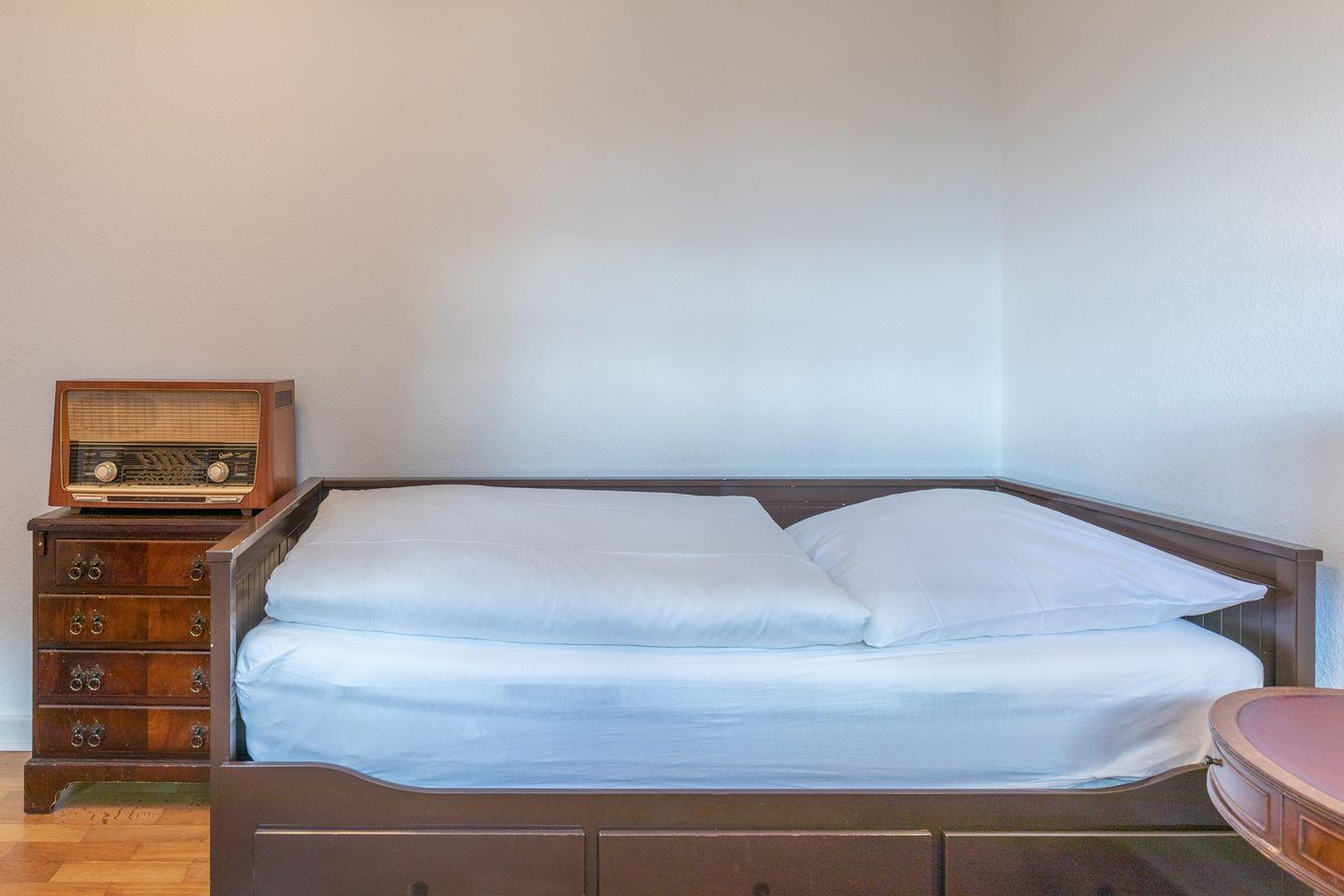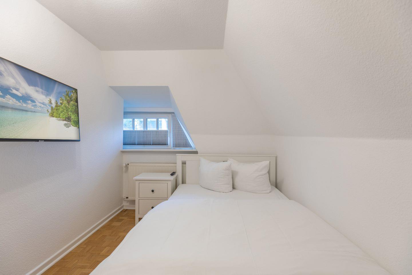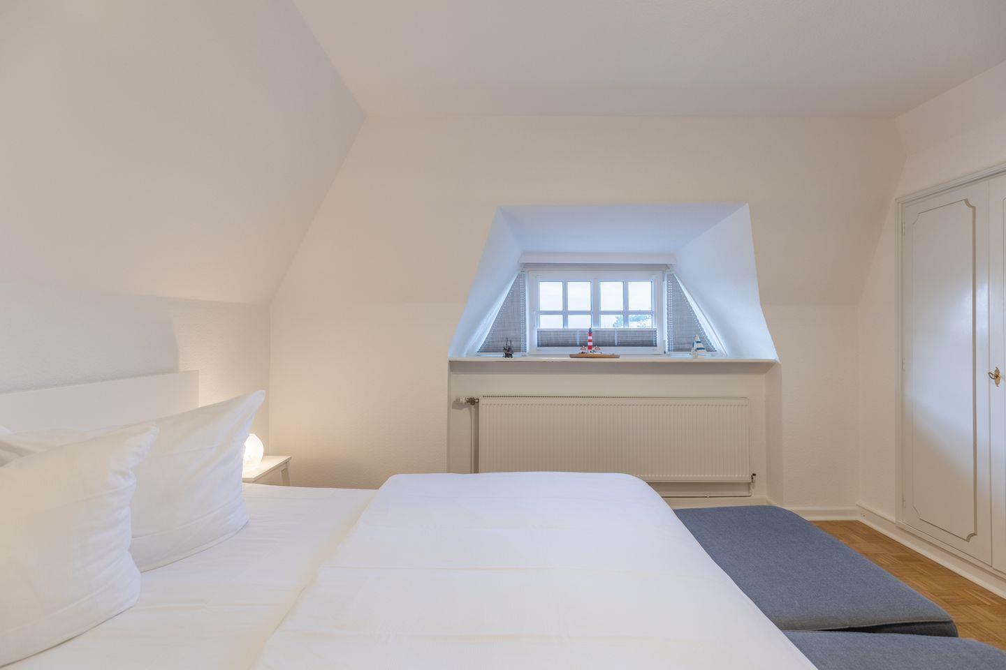 Das Ferienhaus verfügt über vier Schlafzimmer: eines im Erdgeschoss mit einem ausziehbaren Kojenbett, die anderen drei sind über eine Treppe (recht steile, geschlossene Holztreppe) im Obergeschoss erreichbar. Die Betten (180x 200, 140x200 und 90x200) sind bei Ankunft liebevoll bezogen. Vom Elternschlafzimmer aus haben Sie Blick zum Deich und zu den typischen Pfahlbauten.