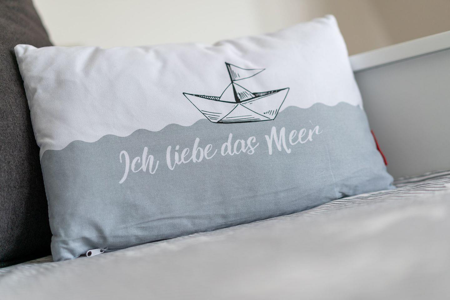 Die neu erbaute, maritim eingerichtete Wohnung erhebt sich über 2 Etagen mit geräumiger, voll ausgestatteter Küche (Ceran, Backofen, Kühl-Gefrierkombi, Geschirrspüler, Mikrowelle, Filter- und Senseo-Pad-Maschine) im Erdgeschoss, die durch eine Treppe mit dem lichtdurchfluteten Wohnzimmer verbunden ist. Hier befindet sich der große Smart-TV(SAT) mit DVD-Player, das Sofa/ Bett für die 3. und 4. Person (zum Doppelbett umfunktionierbares Tagesbett 180x200) und ein Kleiderschrank. Das angrenzende Schlafzimmer verfügt über ein Doppelbett (160x200) und einen Einbauschrank. Ebenfalls in der oberen Etage liegt das Dusch-Bad mit WC, Waschbecken, Handtuchheizkörper und Fön. WLAN kostenfrei, Nichtraucher, keine Haustiere.