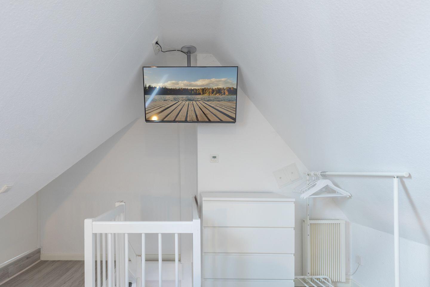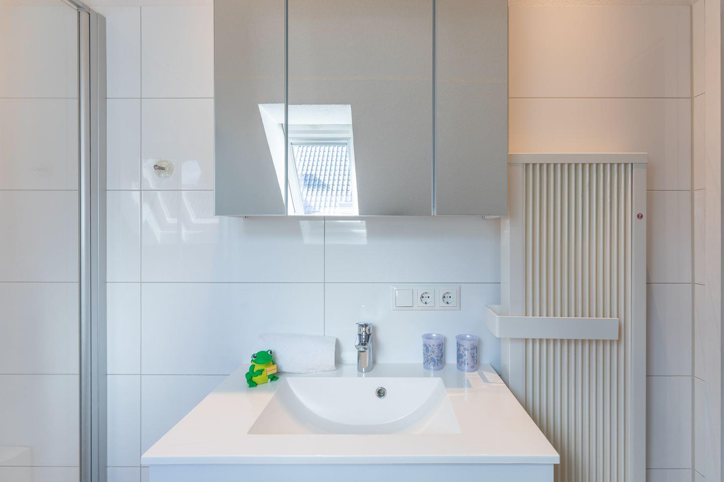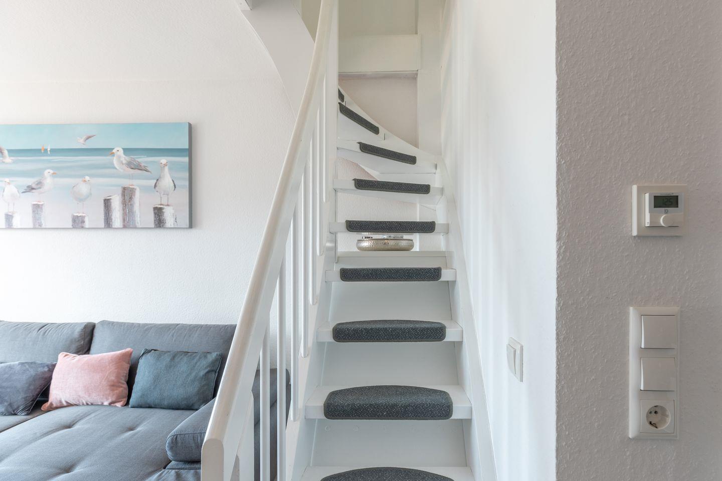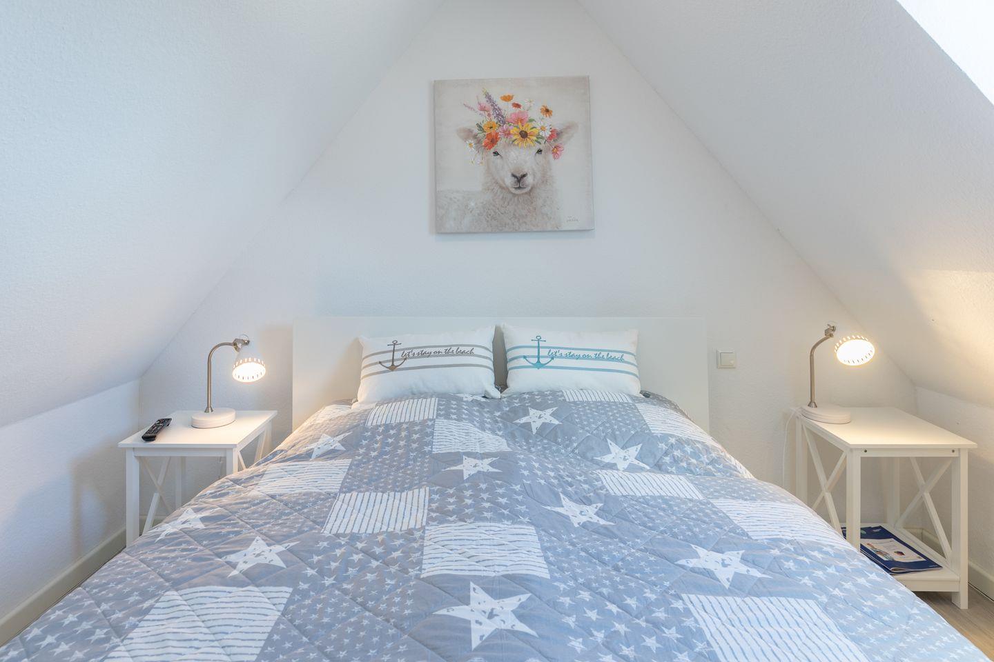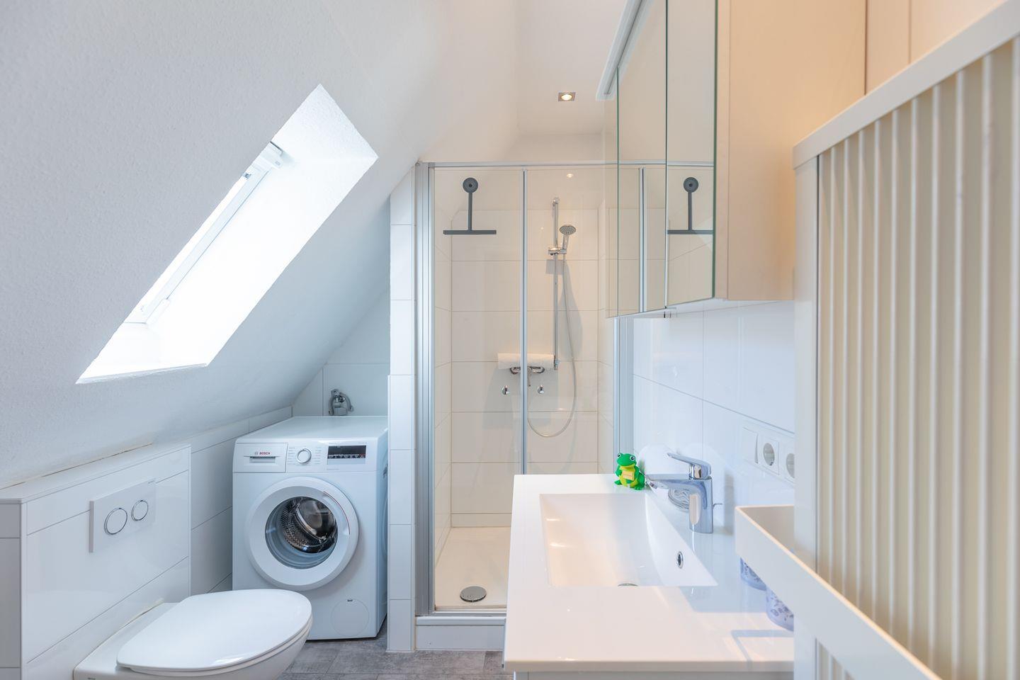 Über eine Treppe – relativ steil und schmal, mit einseitigem Handlauf – gelangen Sie in das Schlafzimmer mit einem bequemen Doppelbett (160x200) und einer Kommode sowie Kleiderstange. Dort steht Ihnen ein weiterer Fernseher mit Netflix zur Verfügung. Das moderne Duschbad/WC mit Tageslicht hat ausreichend Ablageflächen. Hier steht Ihnen eine Waschmaschine zur kostenfreien Nutzung zur Verfügung.