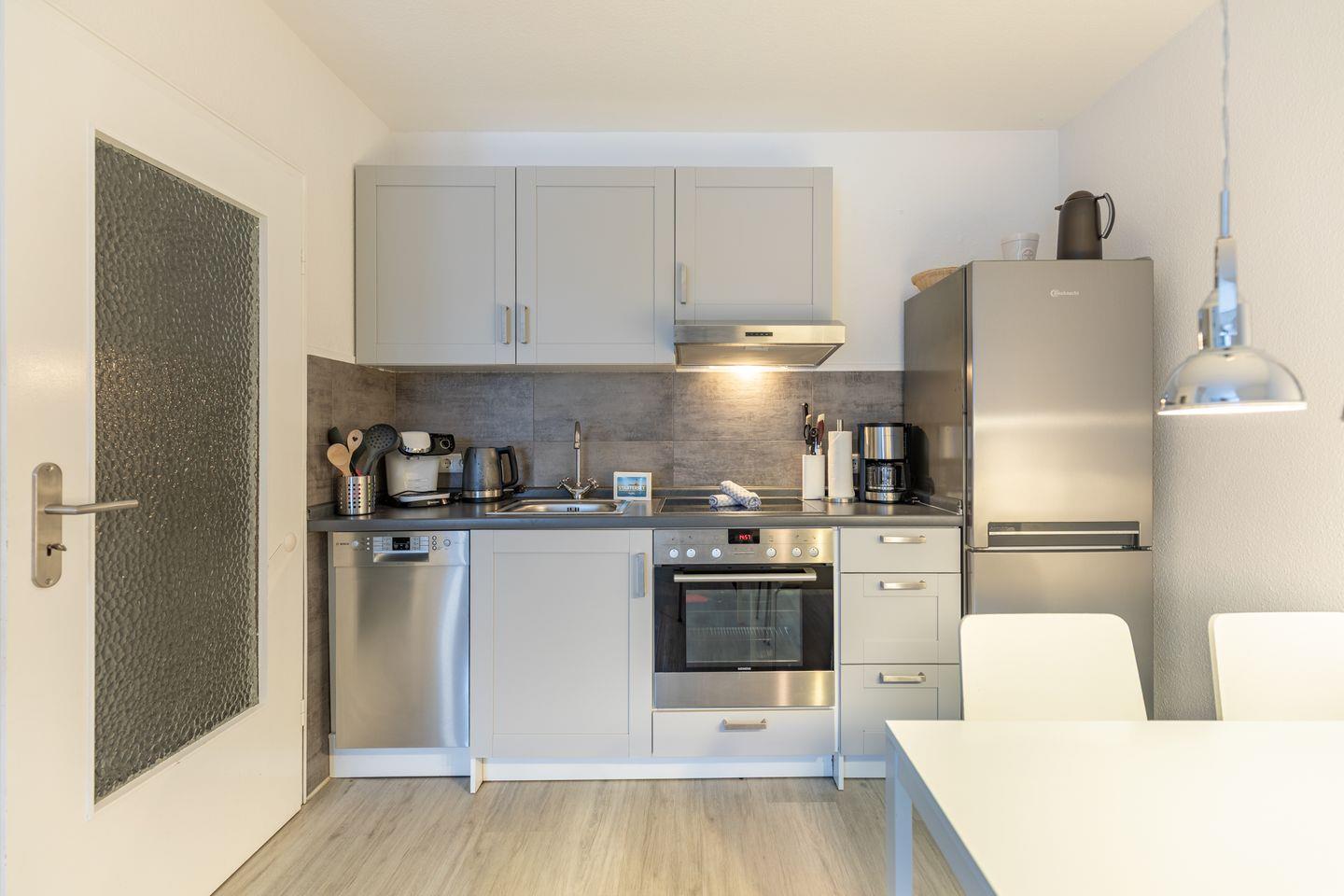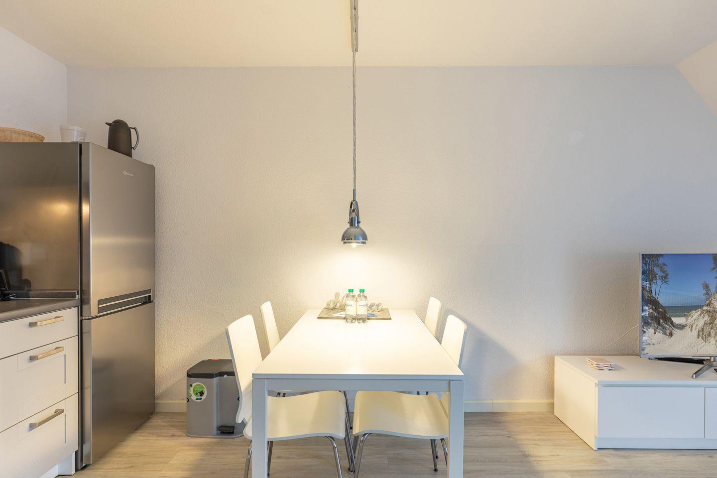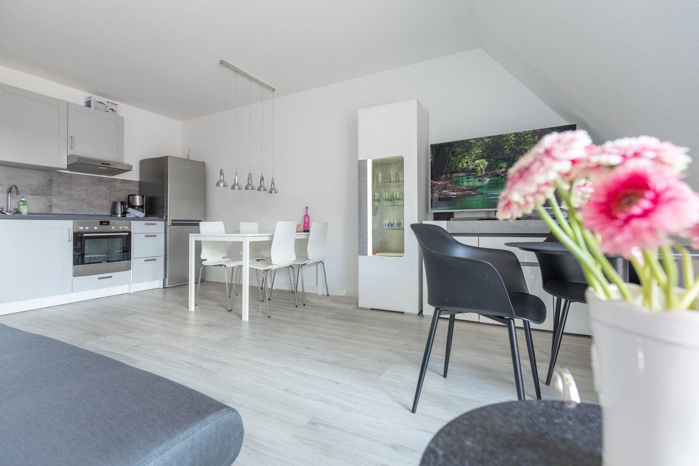 Die knapp 50 qm große Ferienwohnung eignet sich perfekt für zwei Personen. Im hellen Wohnraum finden Sie ein großes, gemütliches Sofa, einen Flachbildfernseher mit Netflix, DVD-Player und eine Mini-Stereoanlage. Ihnen steht ein kostenfreier WLAN-Zugang (Highspeed/Glasfaser) zur Verfügung. Die zum Wohnbereich offene Küche ist mit allem Komfort ausgestattet. Es steht für Sie ein Kaffeeautomat von Bosch zur Verfügung. Ein Esstisch bietet ausreichend Platz für die Mahlzeiten.
