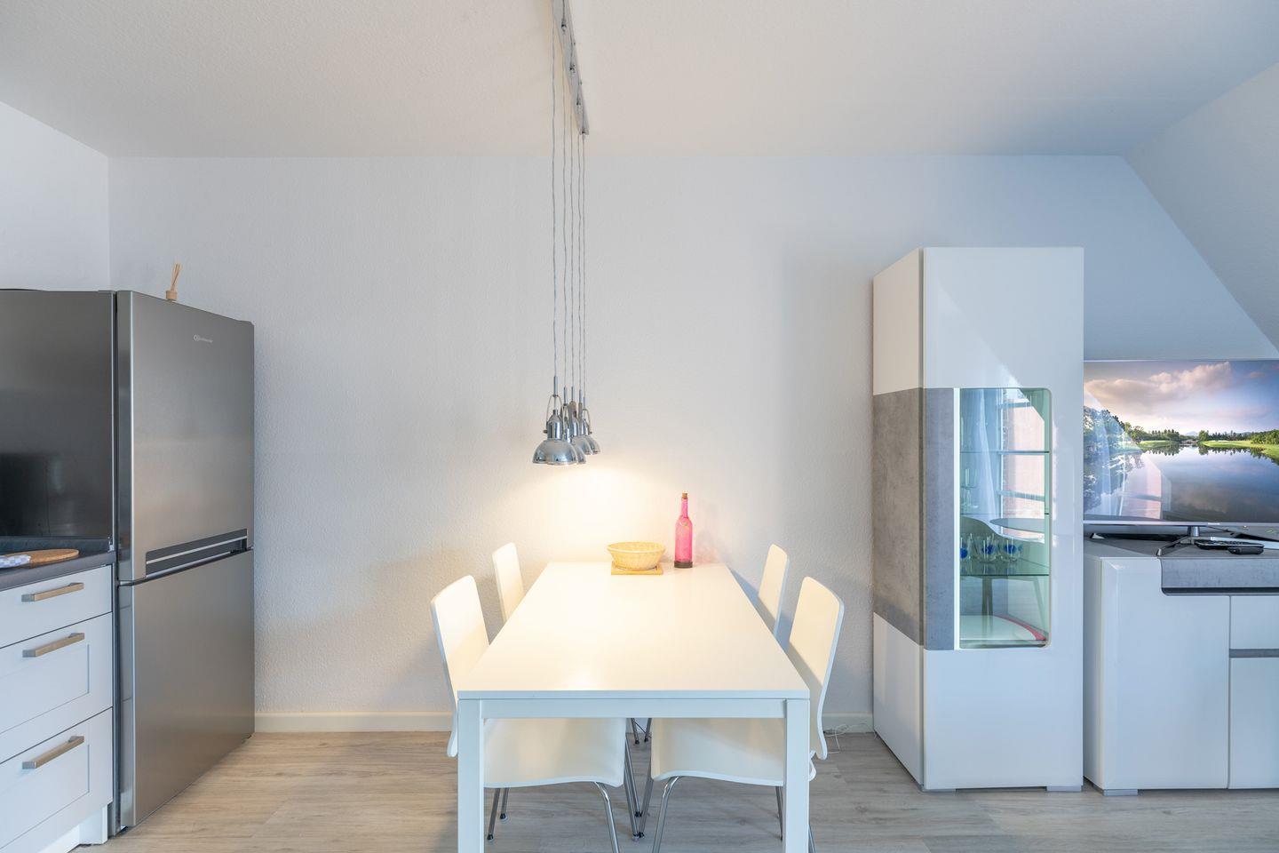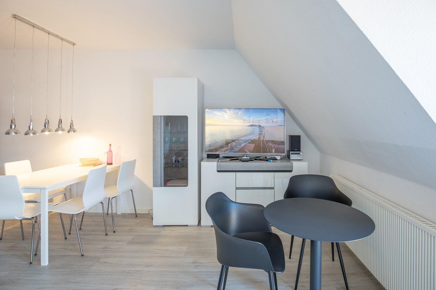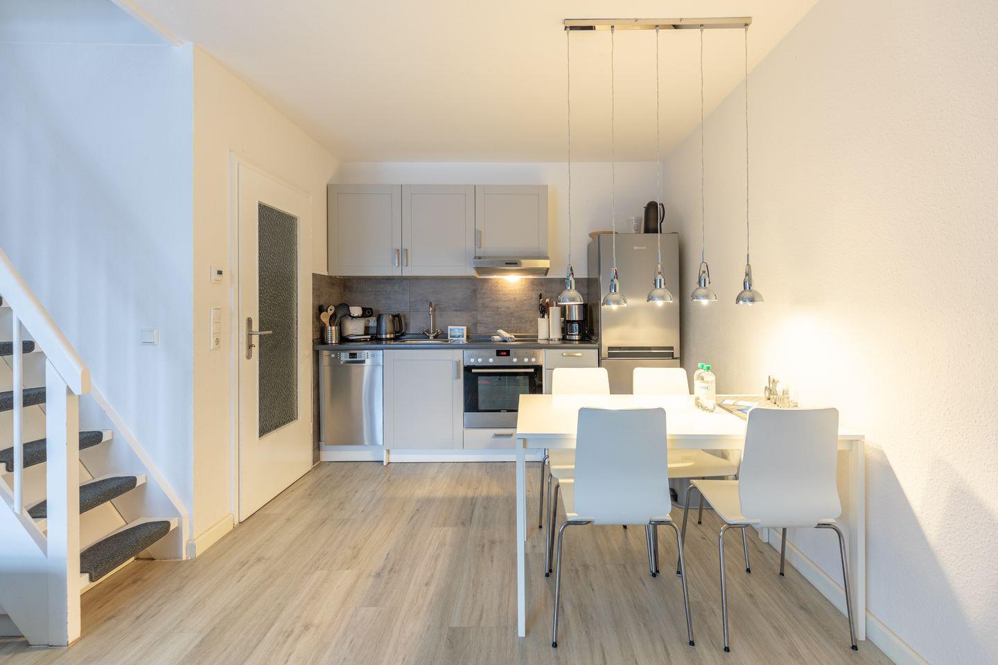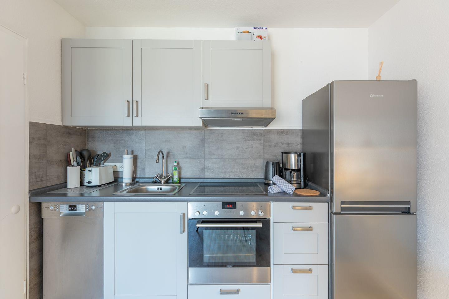 Die knapp 50 qm große Ferienwohnung eignet sich perfekt für zwei Personen. Im hellen Wohnraum finden Sie ein großes, gemütliches Sofa, einen Flachbildfernseher mit Netflix, DVD-Player und eine Mini-Stereoanlage. Ihnen steht ein kostenfreier WLAN-Zugang (Highspeed/Glasfaser) zur Verfügung. Die zum Wohnbereich offene Küche ist mit allem Komfort ausgestattet. Es steht für Sie ein Kaffeeautomat von Bosch zur Verfügung. Ein Esstisch bietet ausreichend Platz für die Mahlzeiten.