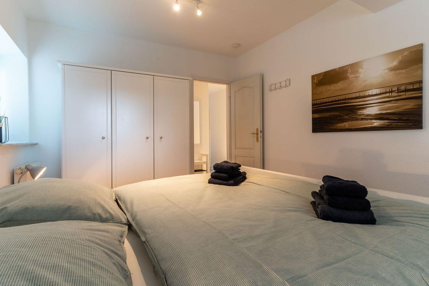 Die Wohnung verfügt über zwei Schlafzimmer, die jeweils mit komfortablen Betten (SZ 1 Doppelbett, SZ 2 2 Einzelbetten), gemütlichen Decken und Kissen sowie ausreichend Stauraum für Ihr Gepäck ausgestattet sind. Hier werden Sie erholsame Nächte verbringen und Kraft für die Erkundung der Umgebung tanken.