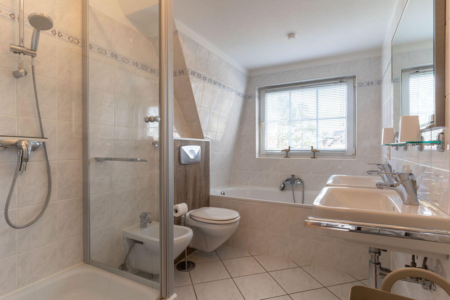 Das moderne Badezimmer ist mit einer Dusche, einem Doppel-Waschbecken, einem WC und einem Bidet ausgestattet. Hier können Sie sich nach einem Tag am Strand erfrischen und die Seele baumeln lassen.