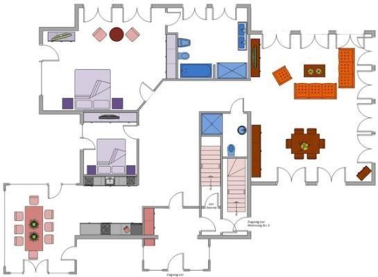 Eingangsbereich, Wohnraum mit Essbereich und Zugang zum Garten, offene Küche mit großem Essbereich im Wintergarten, ein Schlafzimmer mit Doppelbett (200 x 200 cm) und angegliedertem Wannenbad/ WC mit separater Dusche und Bidet, ein Schlafzimmer mit Doppelbett (180 x 200 cm), ein Duschbad / WC