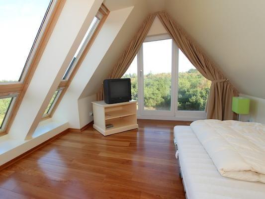 Dachgeschoss: ein Schlafzimmer mit Doppelbett (180 x 200 cm) und eigenem Balkon, ein Schlafzimmer mit Einzelbett (120 x 200 cm), ein Duschbad / WC