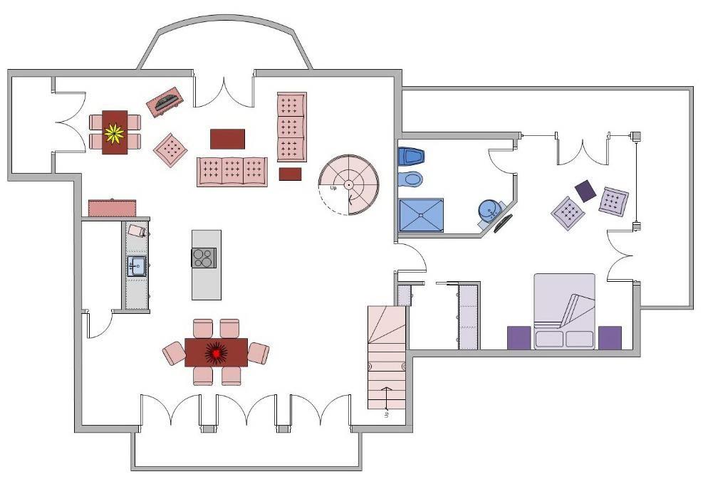 Erdgeschoss: Eingangsbereich, Wohnraum mit Essbereich und Zugang zum Garten, offene Küche mit großem Essbereich im Wintergarten, ein Schlafzimmer mit Doppelbett (200 x 200 cm) und angegliedertem Wannenbad / WC mit separater Dusche und Bidet, ein Schlafzimmer mit Doppelbett (180 x 200 cm), ein Duschbad / WC