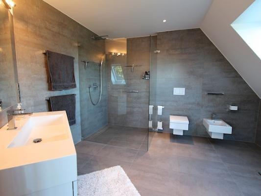 Obergeschoss: eigener Eingangsbereich, Wohnraum mit offener Küche, Essbereich und Zugang zu insgesamt 3 Balkonen, ein Schlafzimmer mit Doppelbett (200 x 200 cm), Ankleideraum, zweiseitig umlaufendem Balkon und angegliedertem Duschbad / WC mit ebenerdiger Dusche und Bidet
