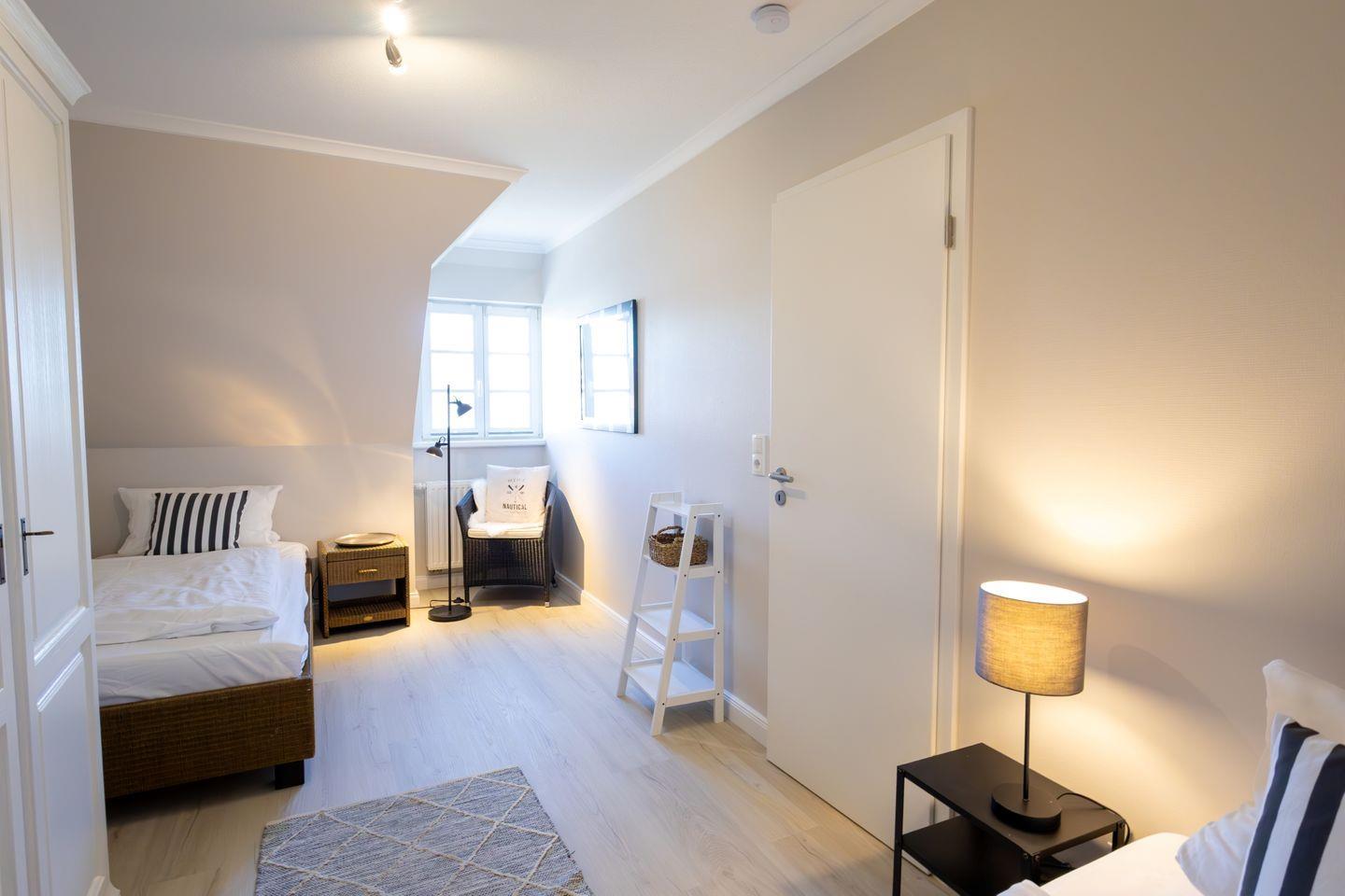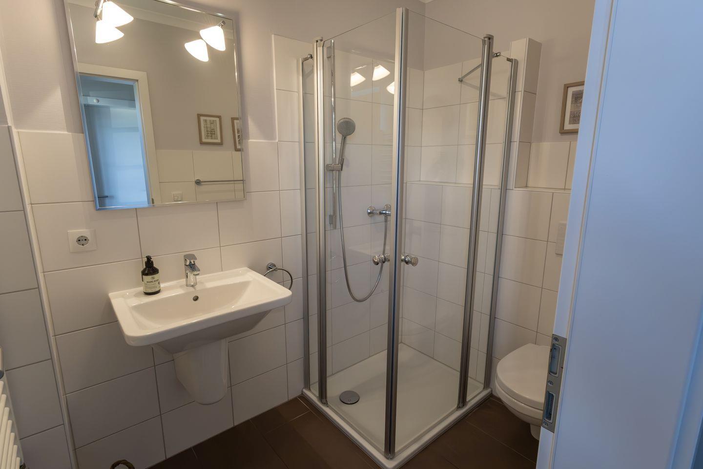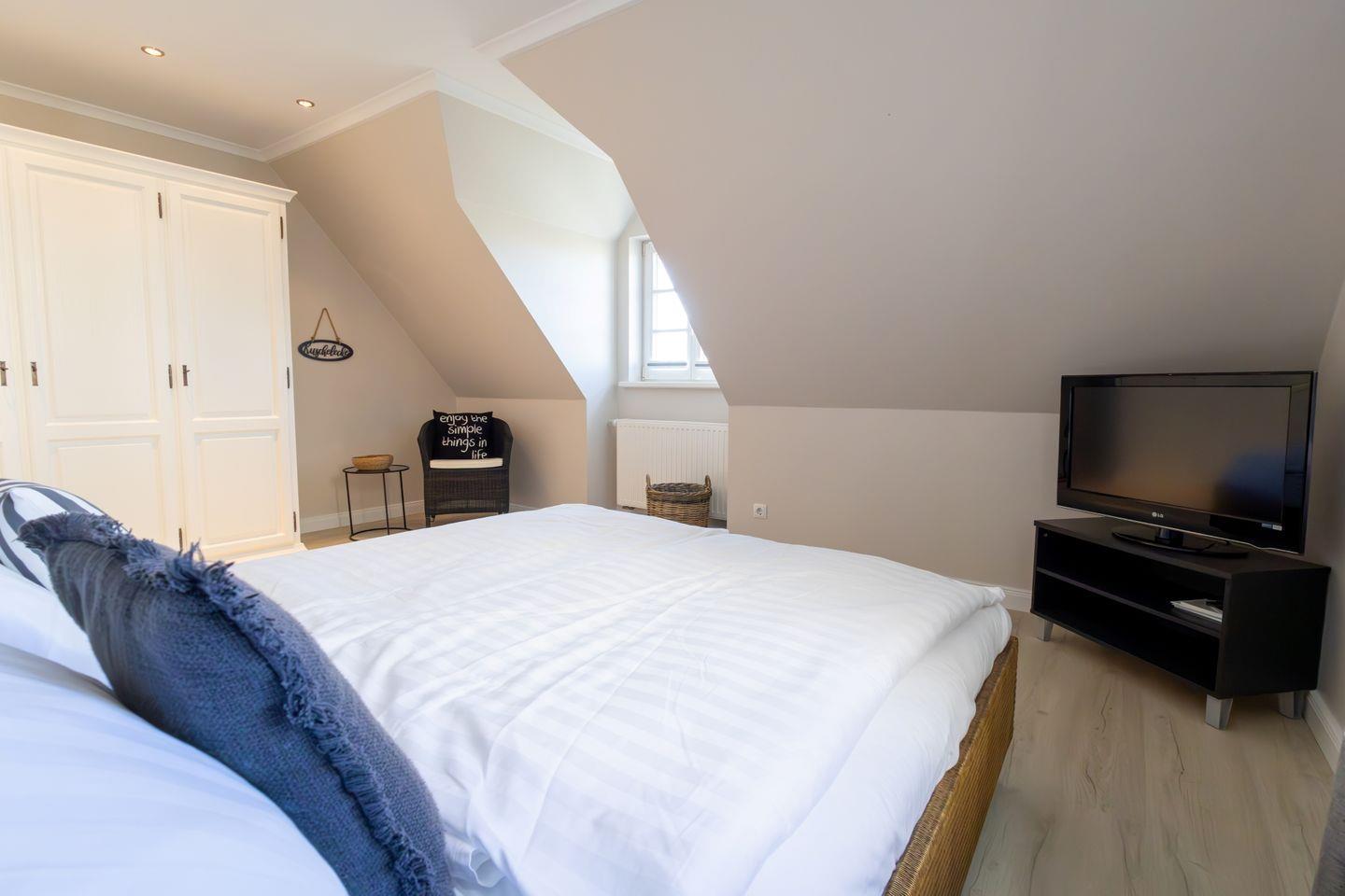 Obergeschoss: ein Schlafzimmer mit Doppelbett (160 x 200 cm) und TV, ein Schlafzimmer mit 2 Einzelbetten (je 100 x 200 cm), ein Duschbad / WC
