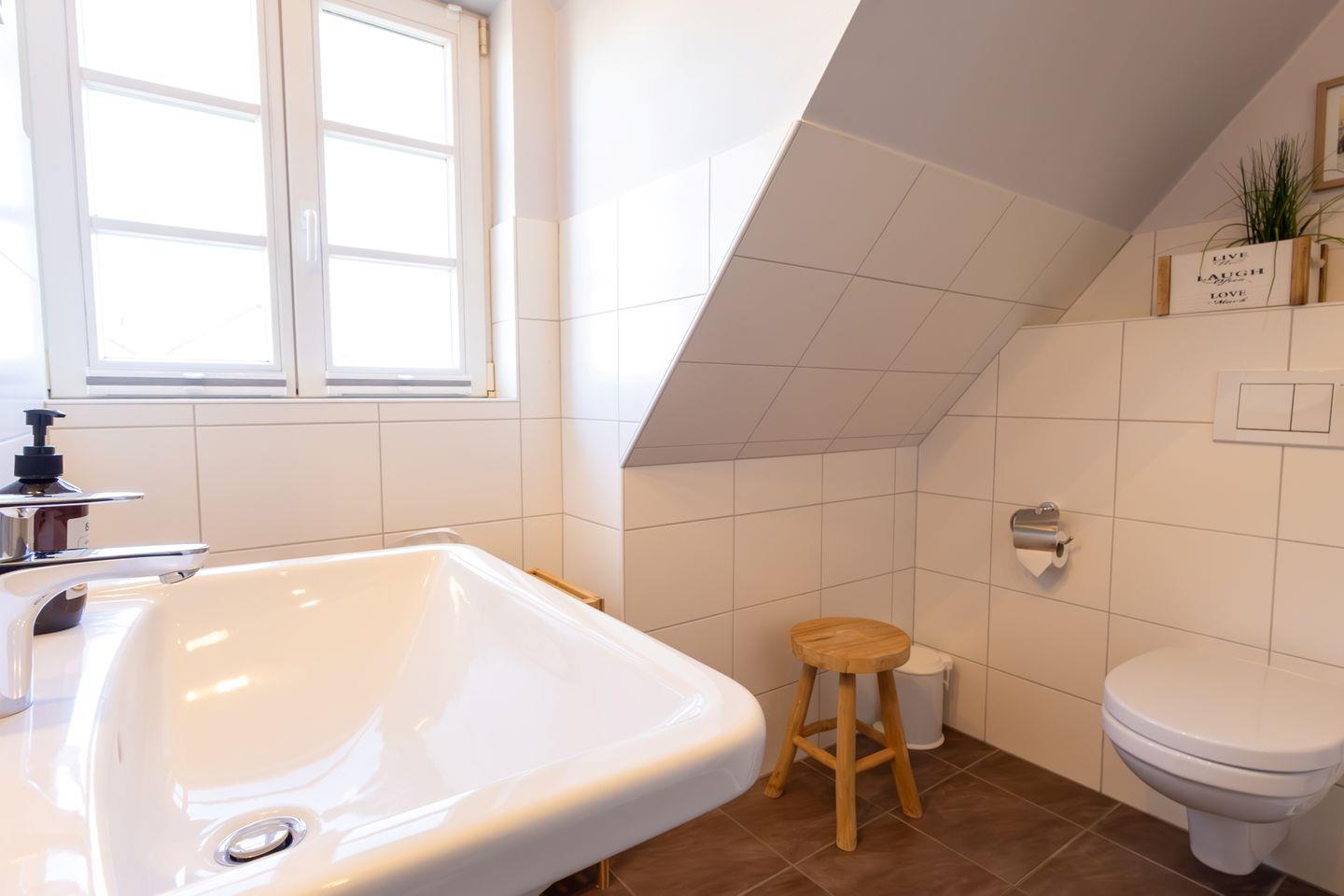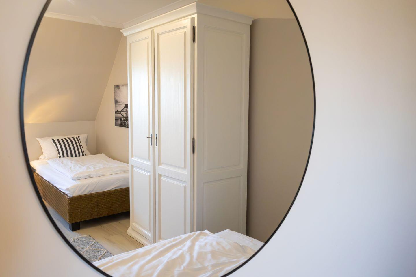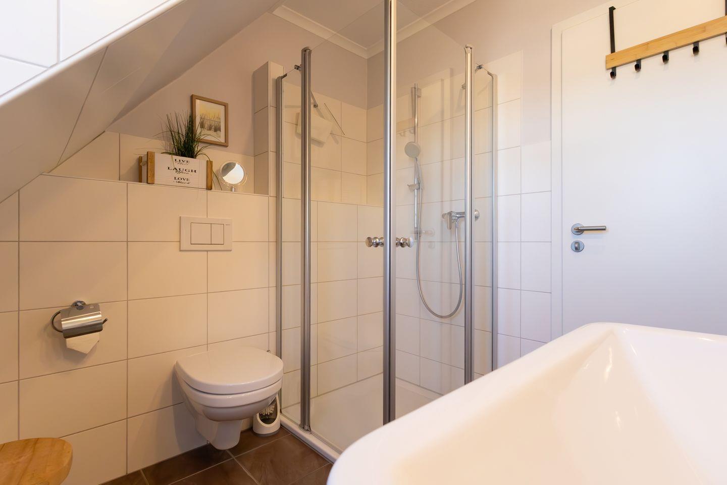 Obergeschoss: ein Schlafzimmer mit Doppelbett (160 x 200 cm) und TV, ein Schlafzimmer mit 2 Einzelbetten (je 100 x 200 cm), ein Duschbad / WC