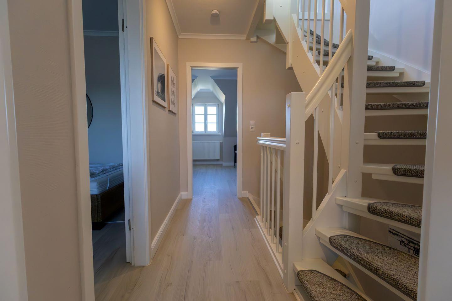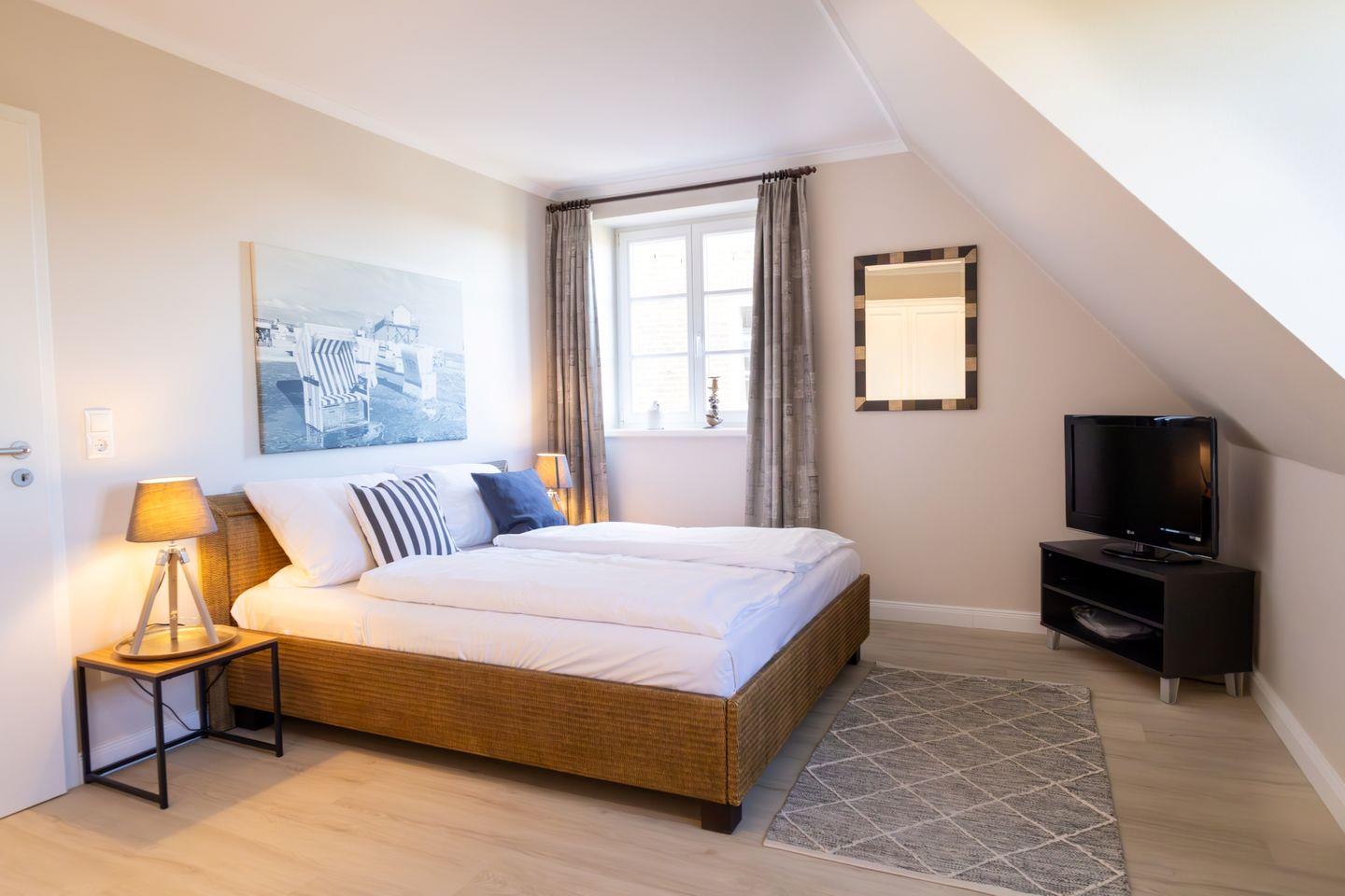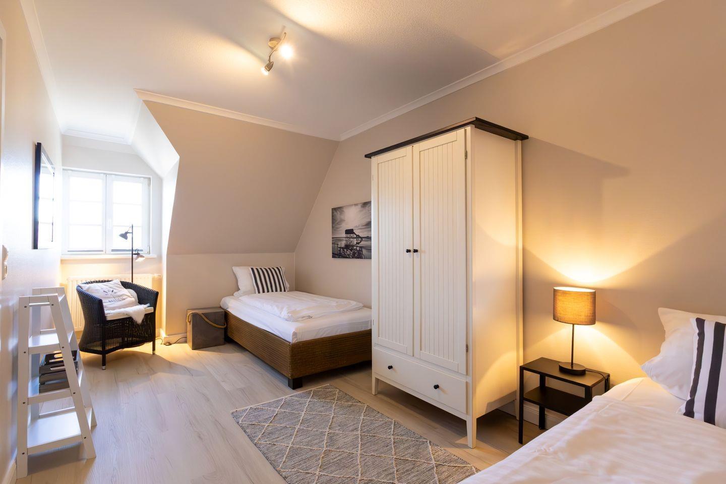 Obergeschoss: ein Schlafzimmer mit Doppelbett (160 x 200 cm) und TV, ein Schlafzimmer mit 2 Einzelbetten (je 100 x 200 cm), ein Duschbad / WC