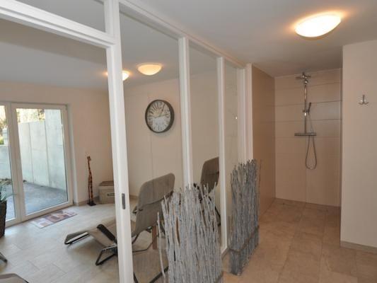 Im Kellergeschoss befindet sich eine Sauna mit angegliedertem Ruhebereich und separatem WC.