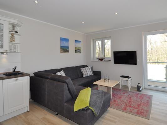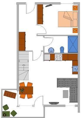 Obergeschoss: Eingangsbereich, Wohnraum mit integrierter Küche, Essbereich und Zugang zum Balkon, ein Schlafzimmer mit Doppelbett (180 x 200 cm - Einzelmatratzen), ein Duschbad / WC