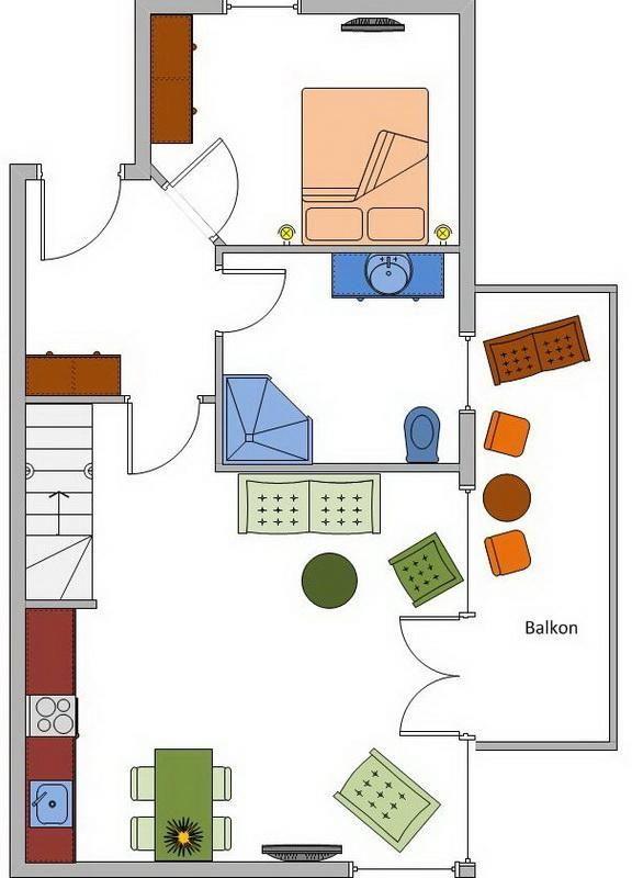 Obergeschoss: Eingangsbereich, Wohnraum mit integrierter Küche, Essbereich und Zugang zum Balkon, ein Schlafzimmer mit Doppelbett (180 x 200 cm), ein Duschbad / WC