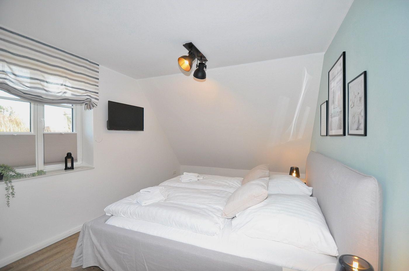 Obergeschoss: 2 Schlafzimmer mit Doppelbett (je 180 x 200 cm - Einzelmatratzen) und TV, ein Duschbad / WC mit ebenerdiger Dusche, Handtuchwärmer und Sauna