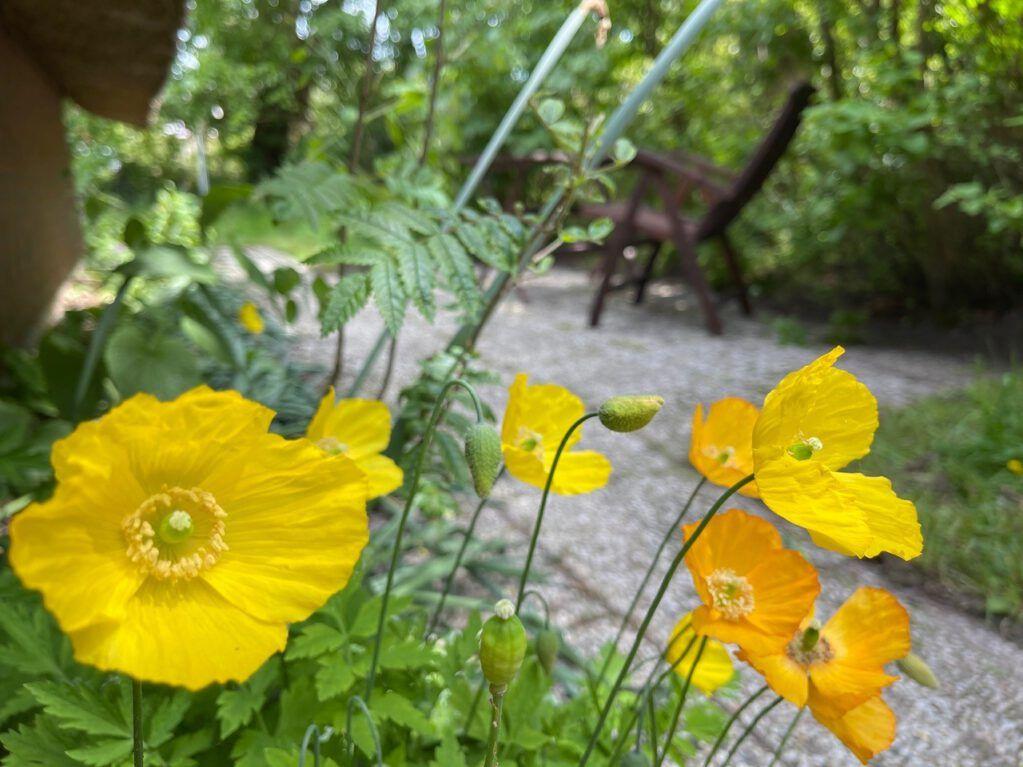 Garten mit Gartenmöbeln und Sitzmöglichkeit am Bach