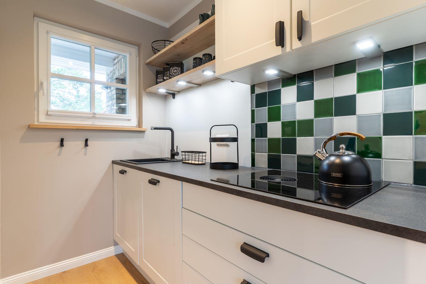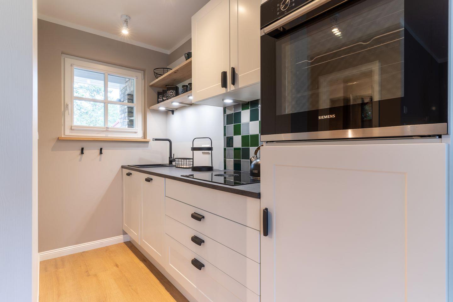Im Erdgeschoss befindet sich ein großzügiger Wohnraum mit TV und einer modernen Wohnküche. Die Küche ist voll ausgestattet und verfügt über hochwertige Elektrogeräte.