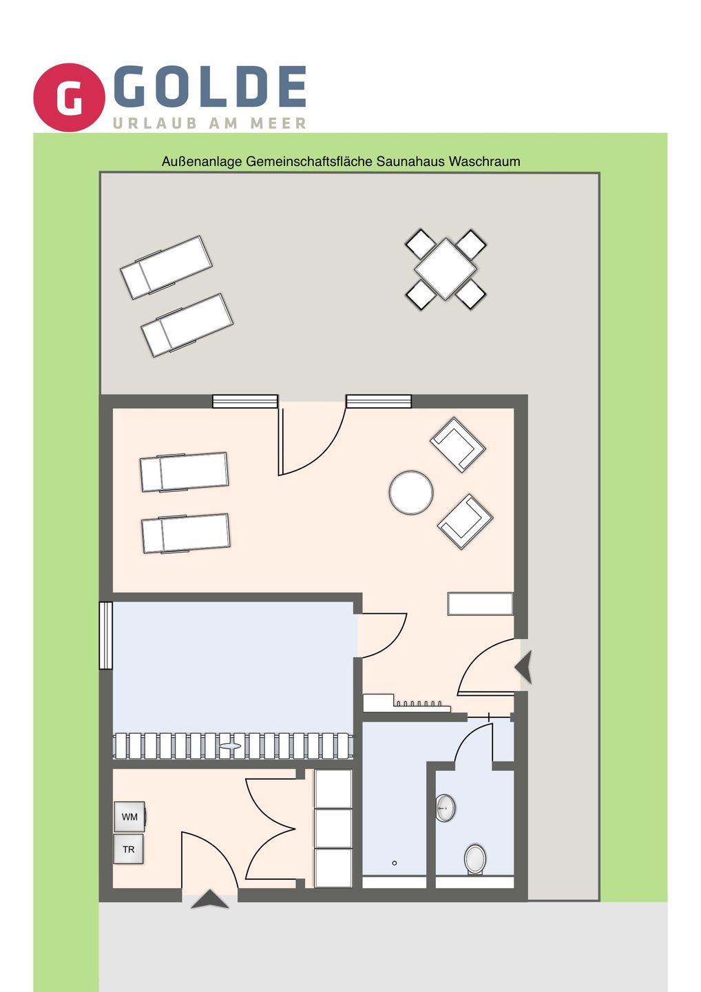 Auf dem Grundstück befindet sich eine hochwertige Außensauna mit Ruheraum für genügend Freiraum zur Erholung. Die Gemeinschaftssauna ist von allen 15 Appartements aus dem Haus nutzbar, sowie die Waschmaschinen und der Trockner im Waschraum.