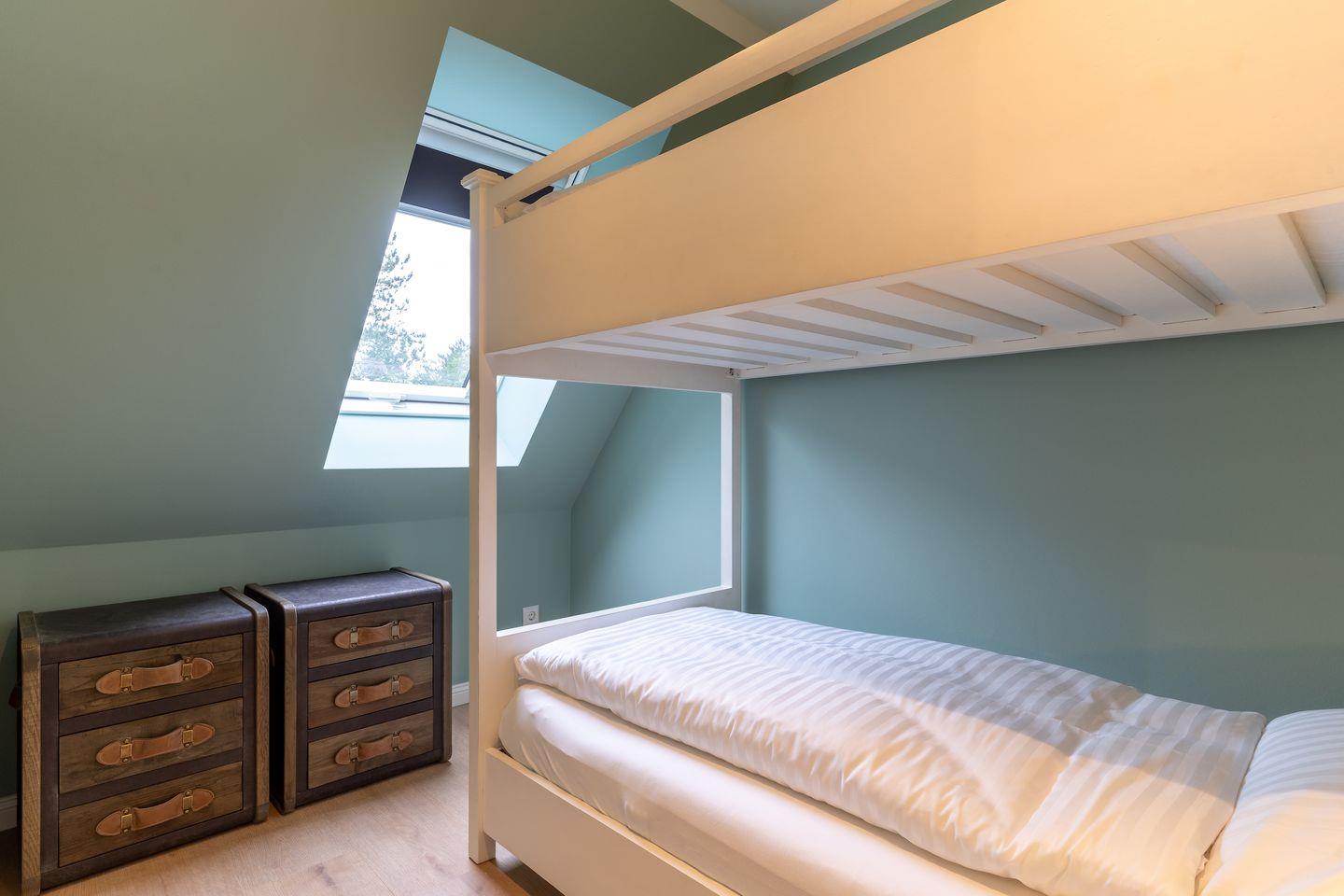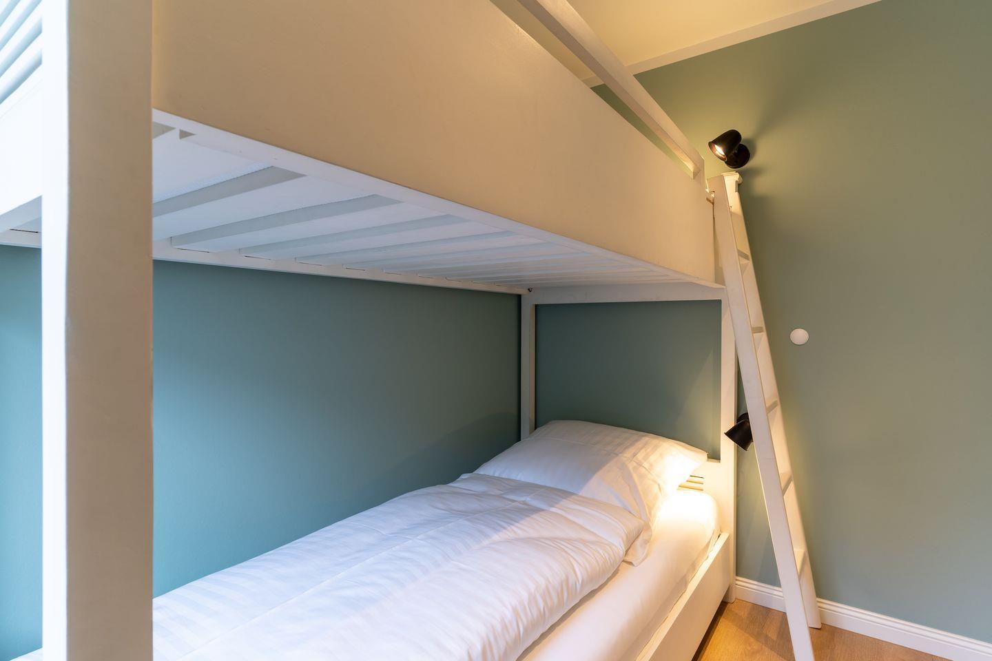 Über eine Wendeltreppe aus dem Wohnraum gelangt man in das Obergeschoss. Hier befinden sich zwei gemütliche Schlafzimmer, eines mit einem Doppelbett und eines mit einem Etagenbett.