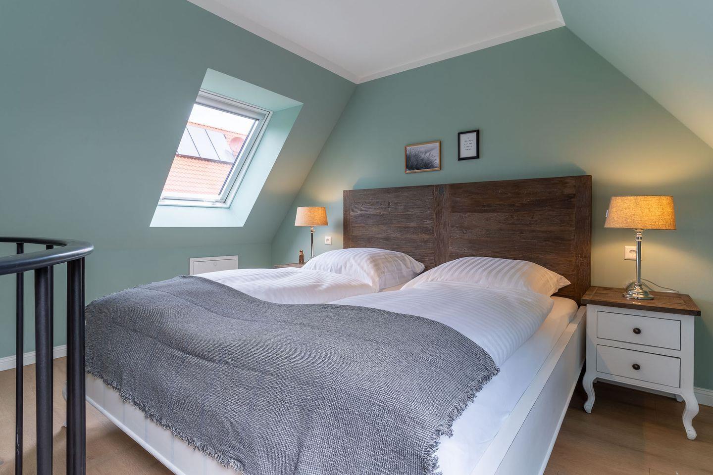 Über eine Wendeltreppe aus dem Wohnraum gelangt man in das Obergeschoss. Hier befindet sich das gemütliche Schlafzimmer, mit einem Doppelbett.