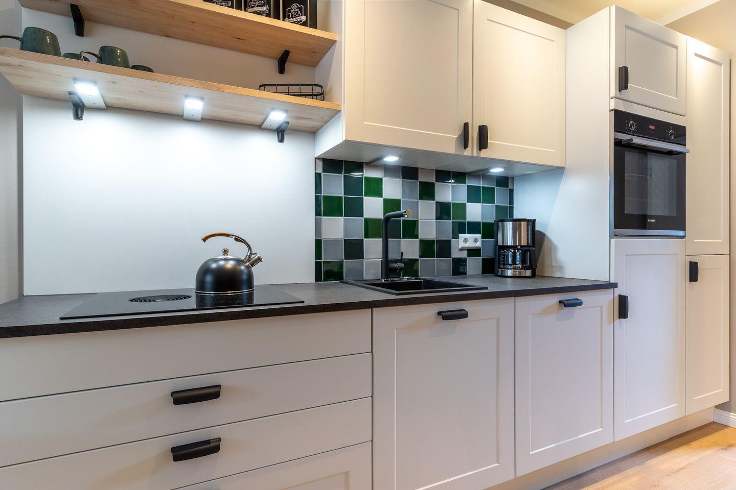 Der lichtdurchflutete Wohnraum mit einer offenen Wohnküche und einem gemütlichen Essbereich bietet jeden Komfort. Die Küche ist voll ausgestattet und verfügt über hochwertige Elektrogeräte.
