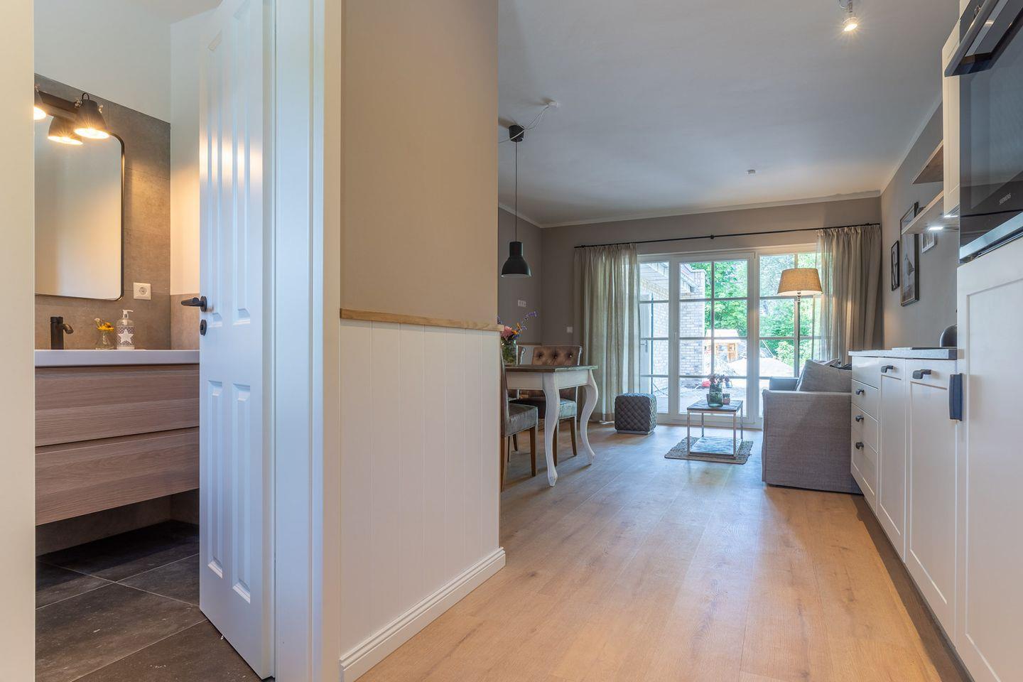 Vom Wohnzimmer gelangen Sie auf eine gemütliche, sonnige Südwest Terrasse mit stylischen Gartenmöbeln. An dem Wohnflur mit Garderobe schließt sich ein Duschbad an.