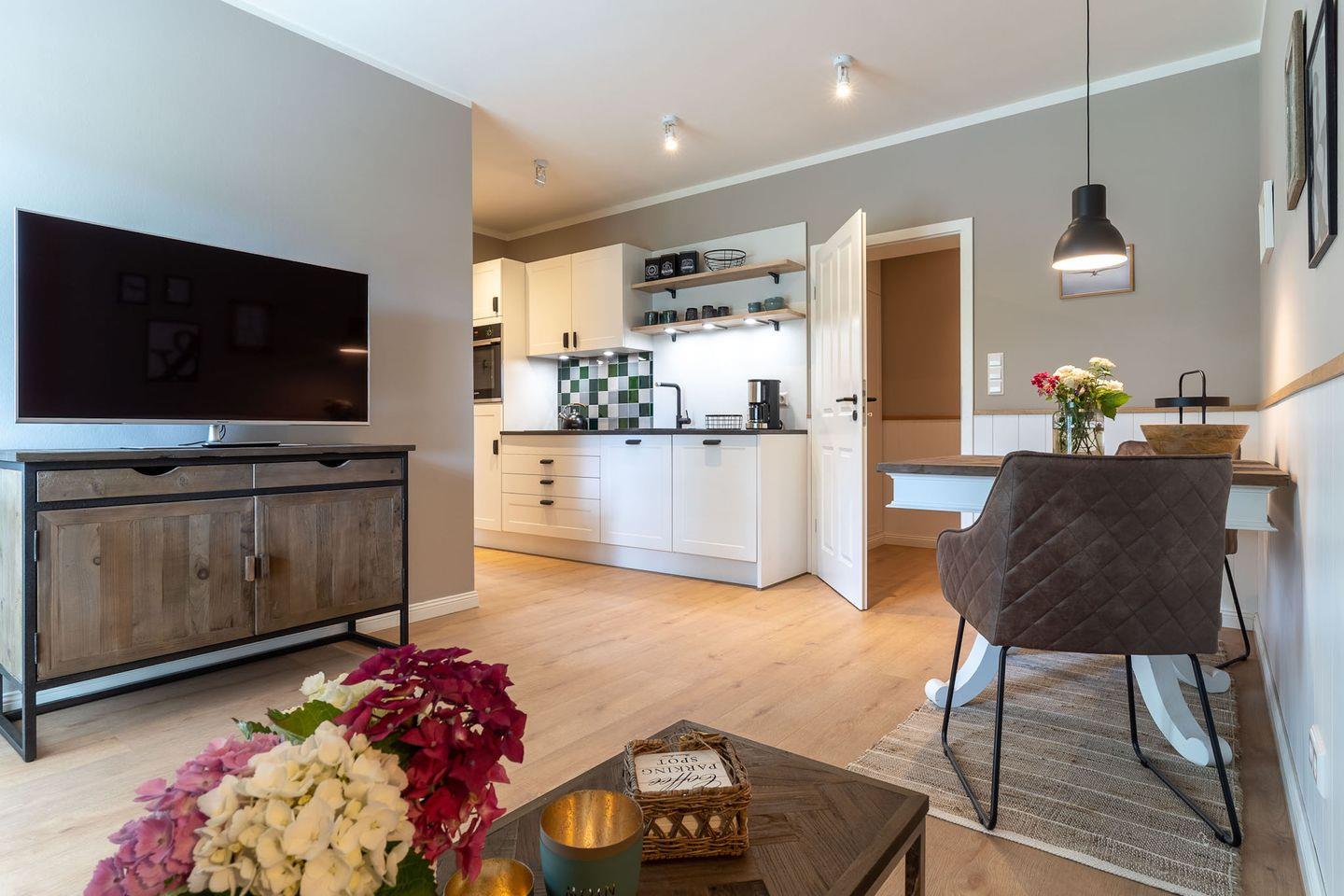 Der lichtdurchflutete Wohnraum mit einer offenen Wohnküche und einem gemütlichen Essbereich bietet jeden Komfort. Die Küche ist voll ausgestattet und verfügt über hochwertige Elektrogeräte.