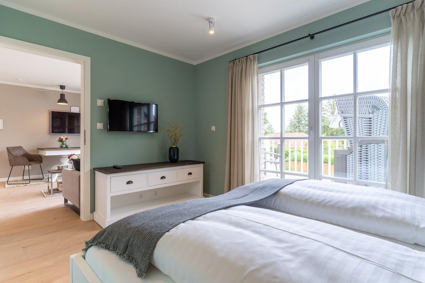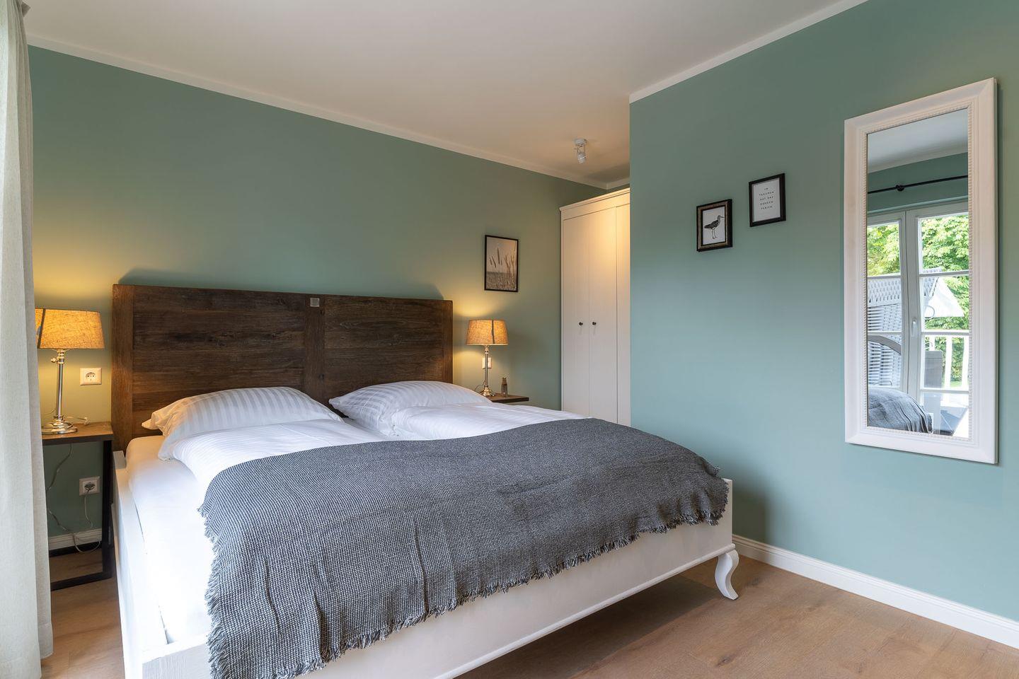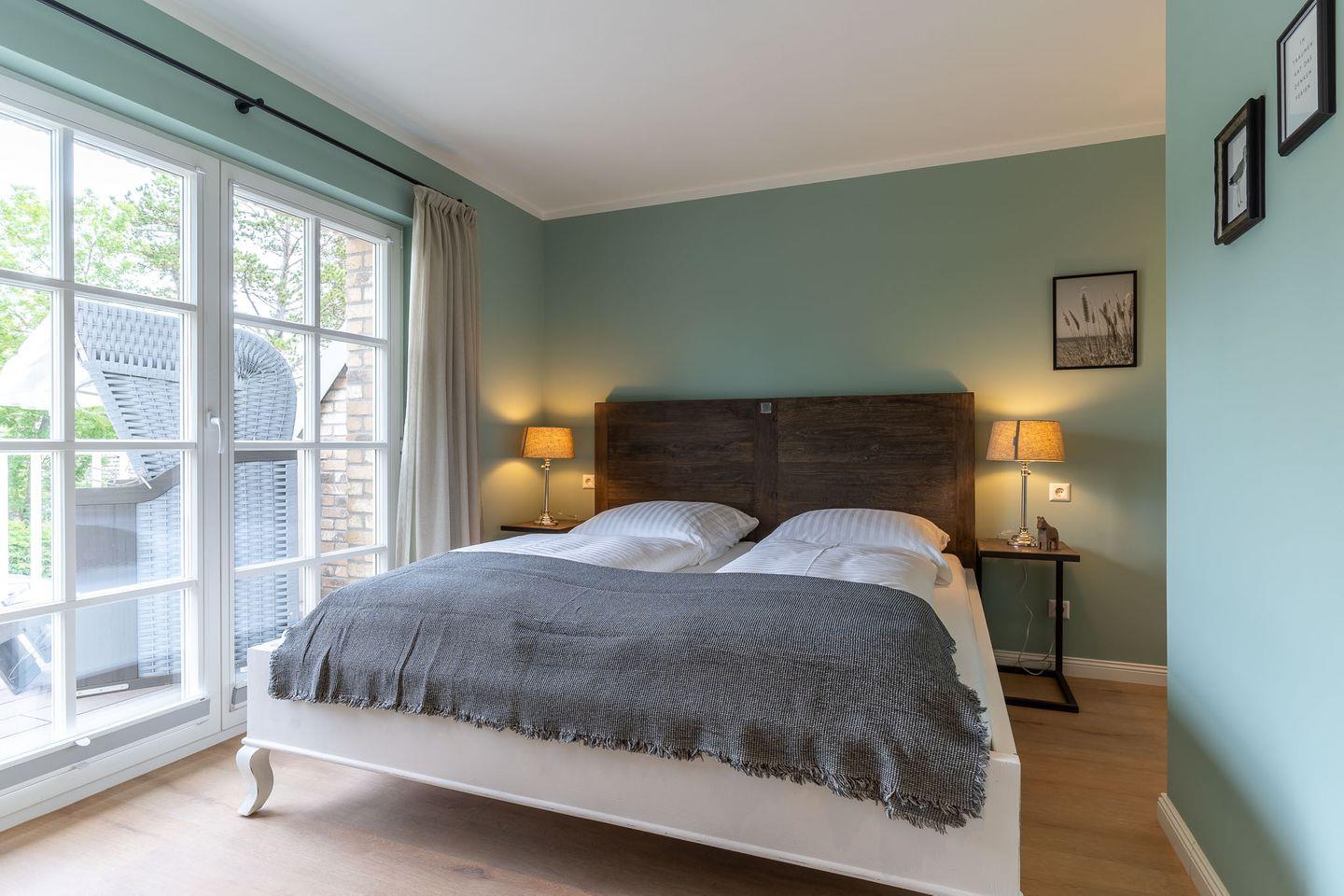 Das gemütliche Schlafzimmer ist mit einem Doppelbett ausgestattet und gewährt Ihnen einen direkten Zugang zum Balkon.