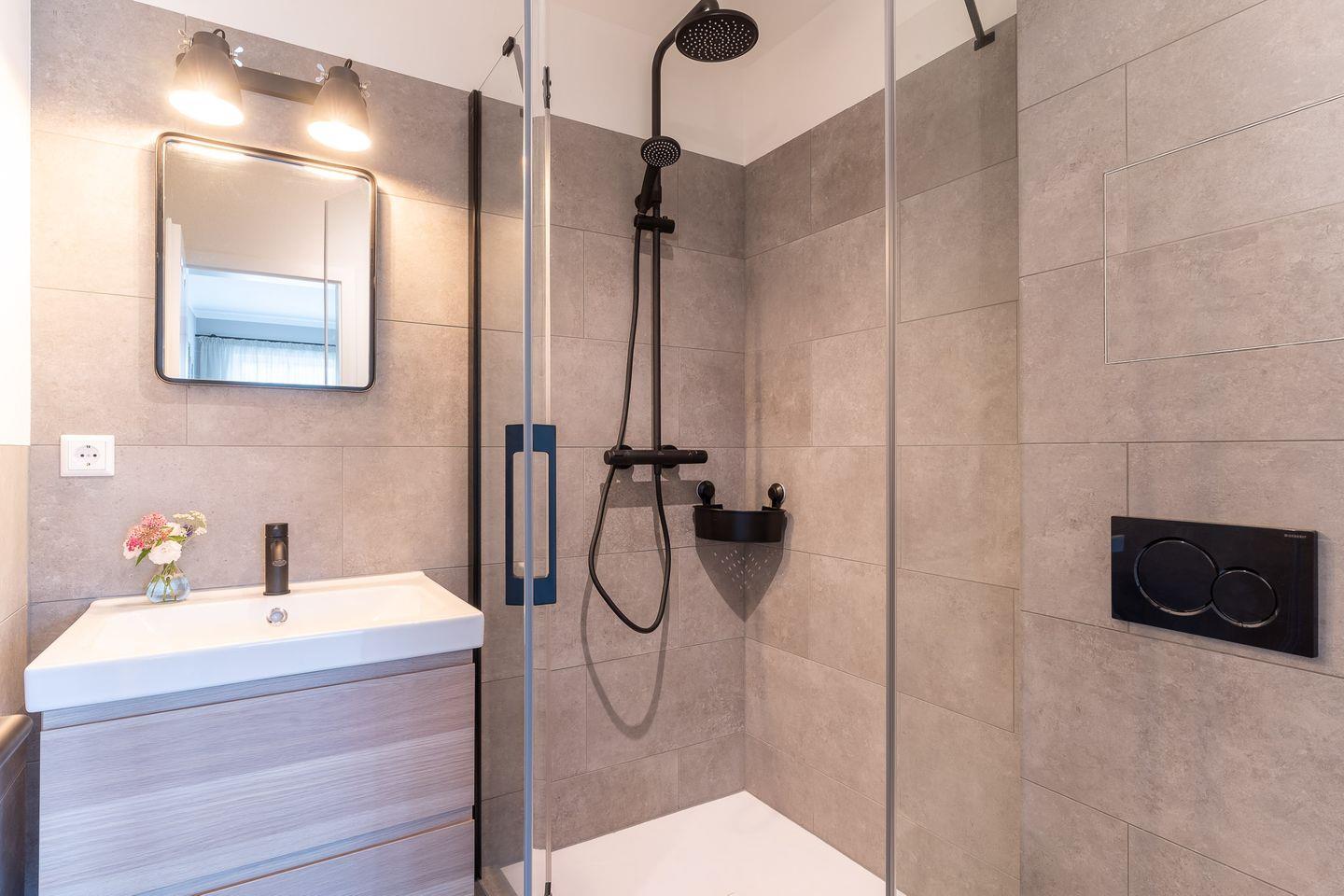 Vom Wohnzimmer gelangen Sie auf den gemütlichen Nord/Ost-Balkon mit stylischen Gartenmöbeln. An den Wohnraum schließt sich ein Duschbad an.