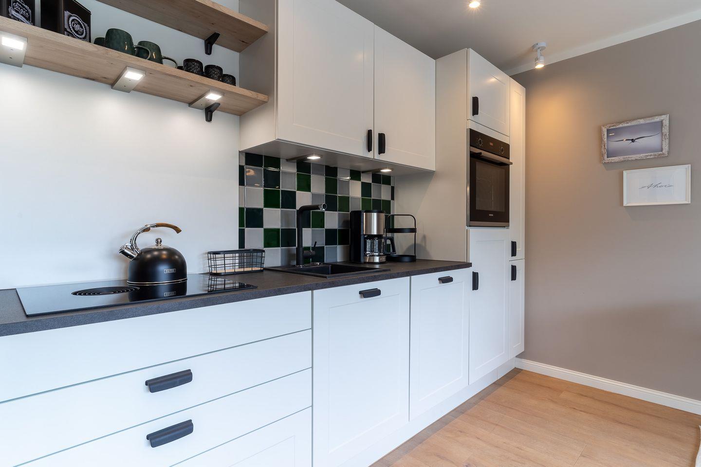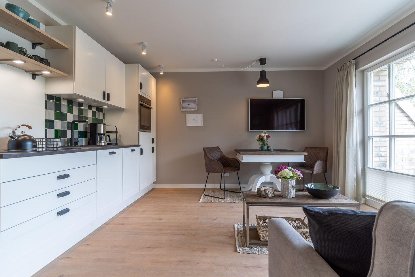 Der lichtdurchflutete Wohnraum mit einer offenen Wohnküche und einem gemütlichen Essbereich bietet jeden Komfort. Die Küche ist voll ausgestattet und verfügt über hochwertige Elektrogeräte.