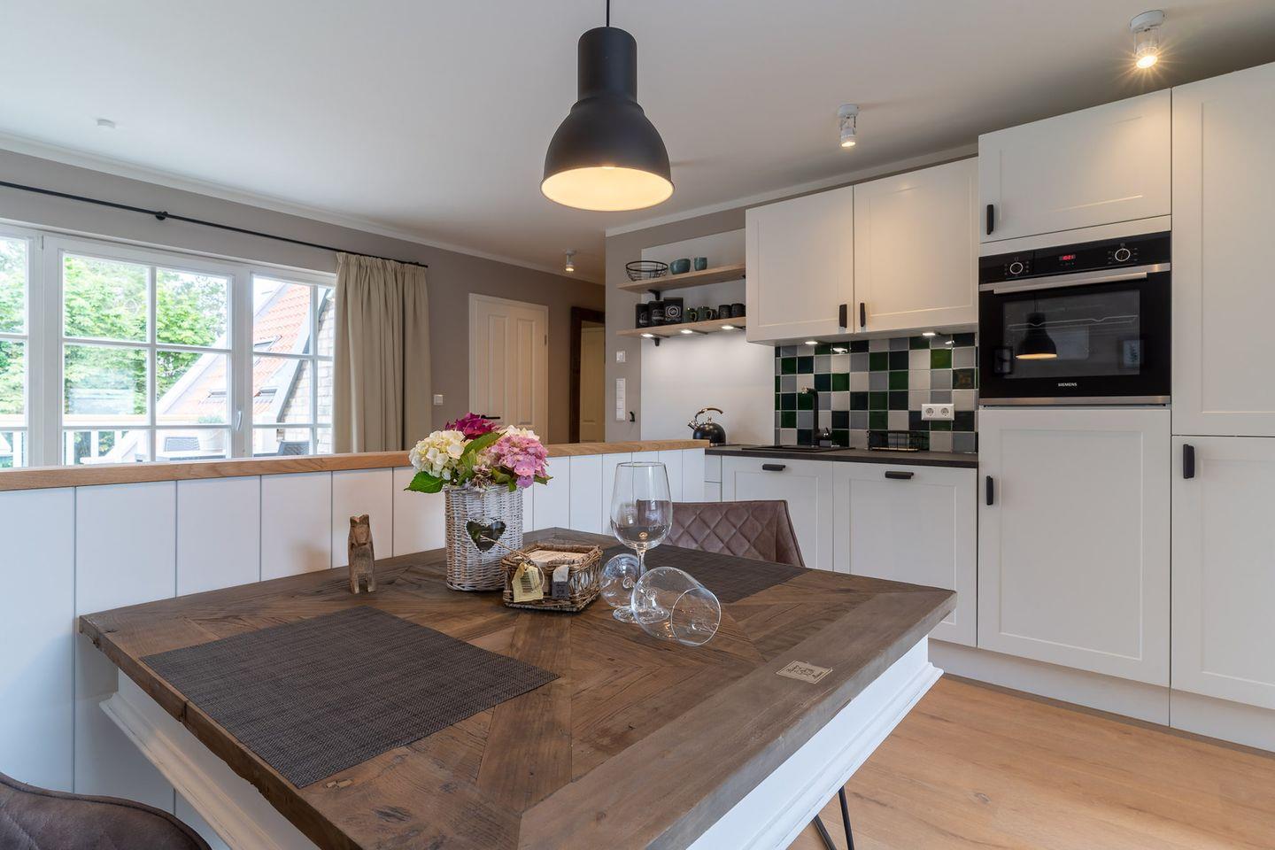 Der lichtdurchflutete Wohnraum mit einer offenen Wohnküche und einem gemütlichen Essbereich bietet jeden Komfort. Die Küche ist mit hochwertigen Geräten voll ausgestattet.