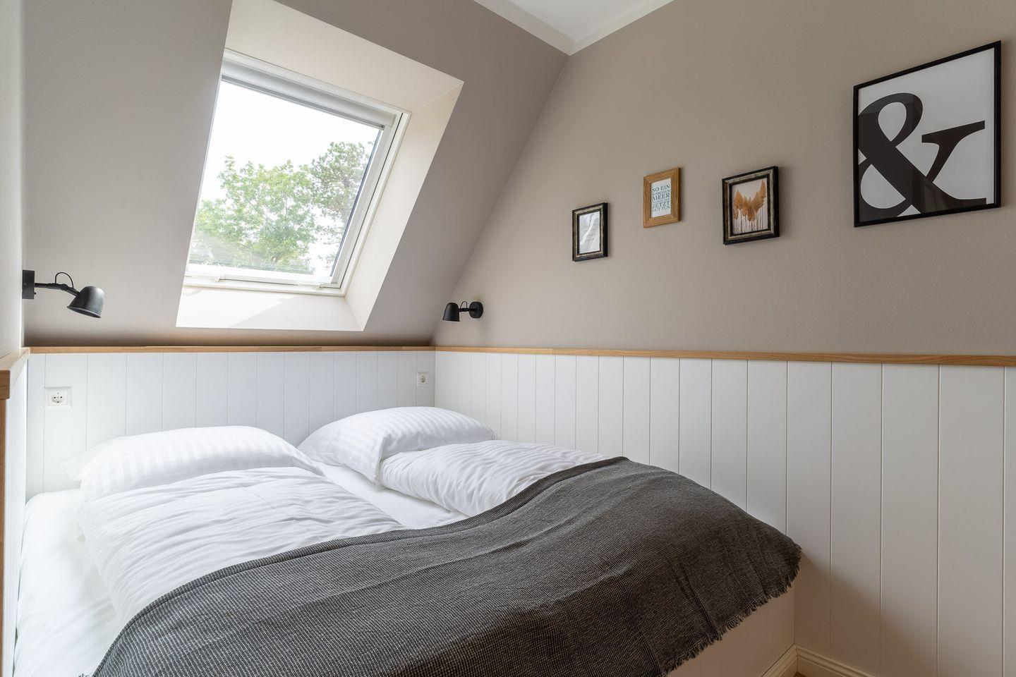 An den Wohnbereich schließt sich ein Duschbad an. Der Schlafbereich ist mit einem Doppelbett ausgestattet.