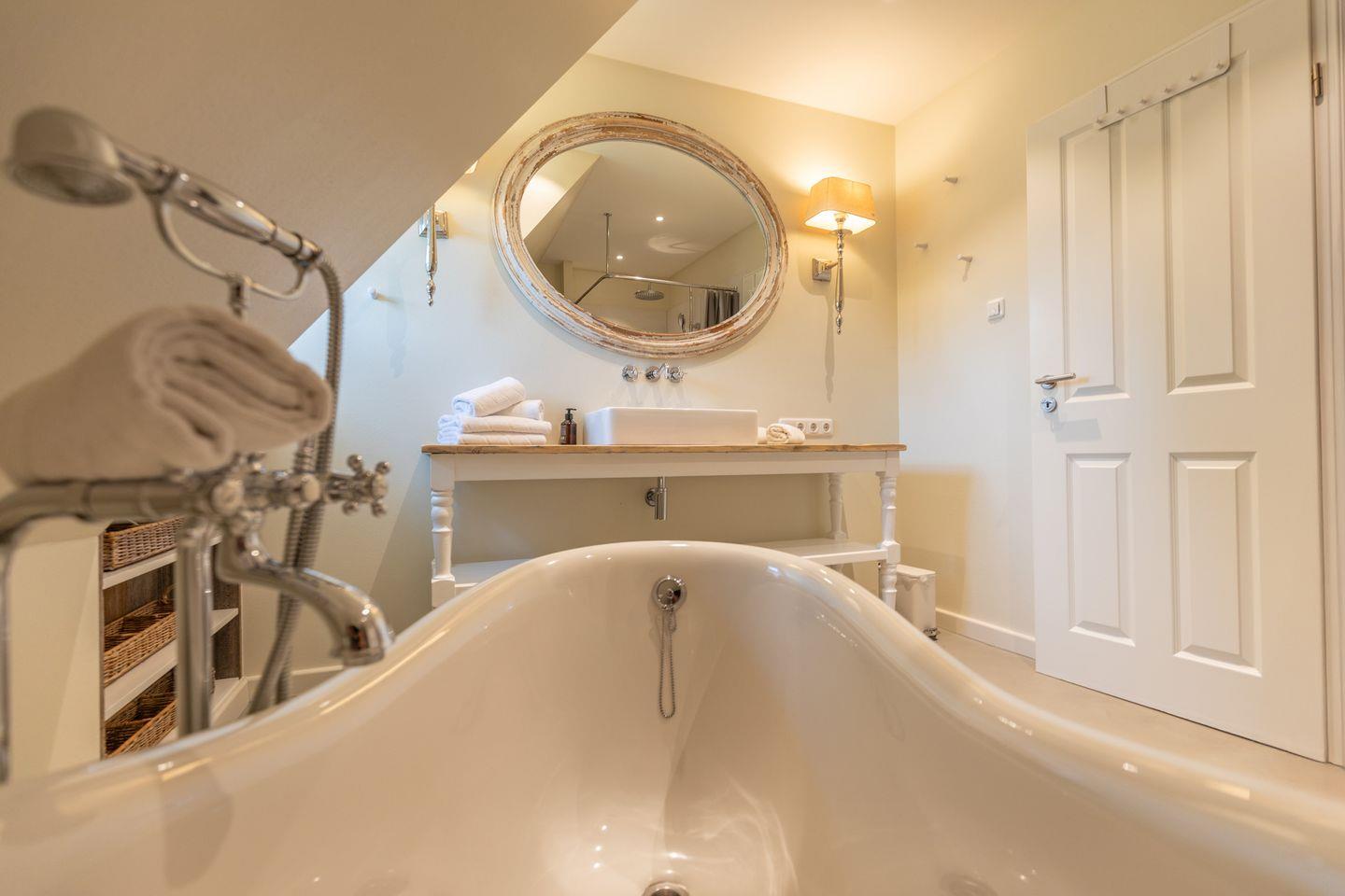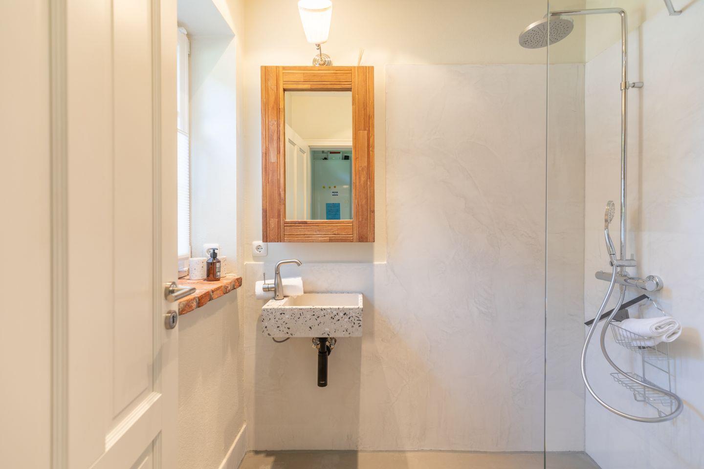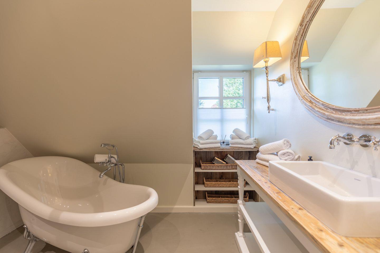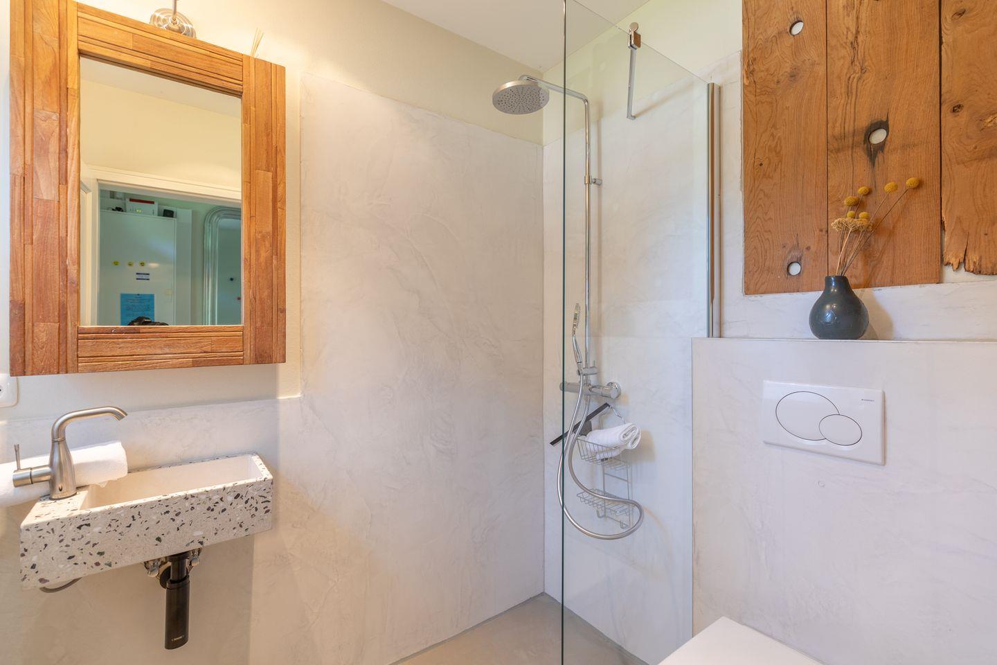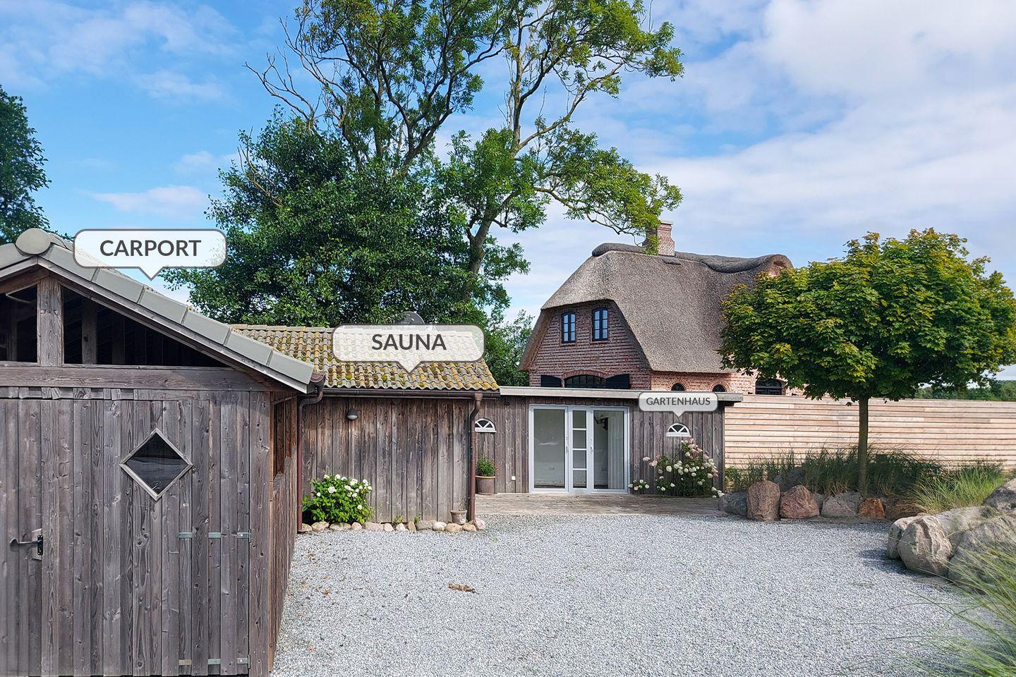 Das große Badezimmer ist sowohl mit einer Badewanne als auch einer ebenerdigen Regendusche ausgestattet. Ein weiteres Bad mit Fenster und ebenerdiger Regendusche sowie Gäste WC befindet sich im Erdgeschoss. Im Hauswirtschaftsraum unter der Treppe stehen zur kostenlosen Nutzung eine Waschmaschine und ein Wäschetrockner bereit. Fahrräder können in einem abschließbaren Schuppen untergebracht werden. In dem Holzhäuschen daneben befindet sich die Sauna. Auf dem Grundstück befinden sich zudem ein Carport sowie ein weiterer PKW Stellplatz.