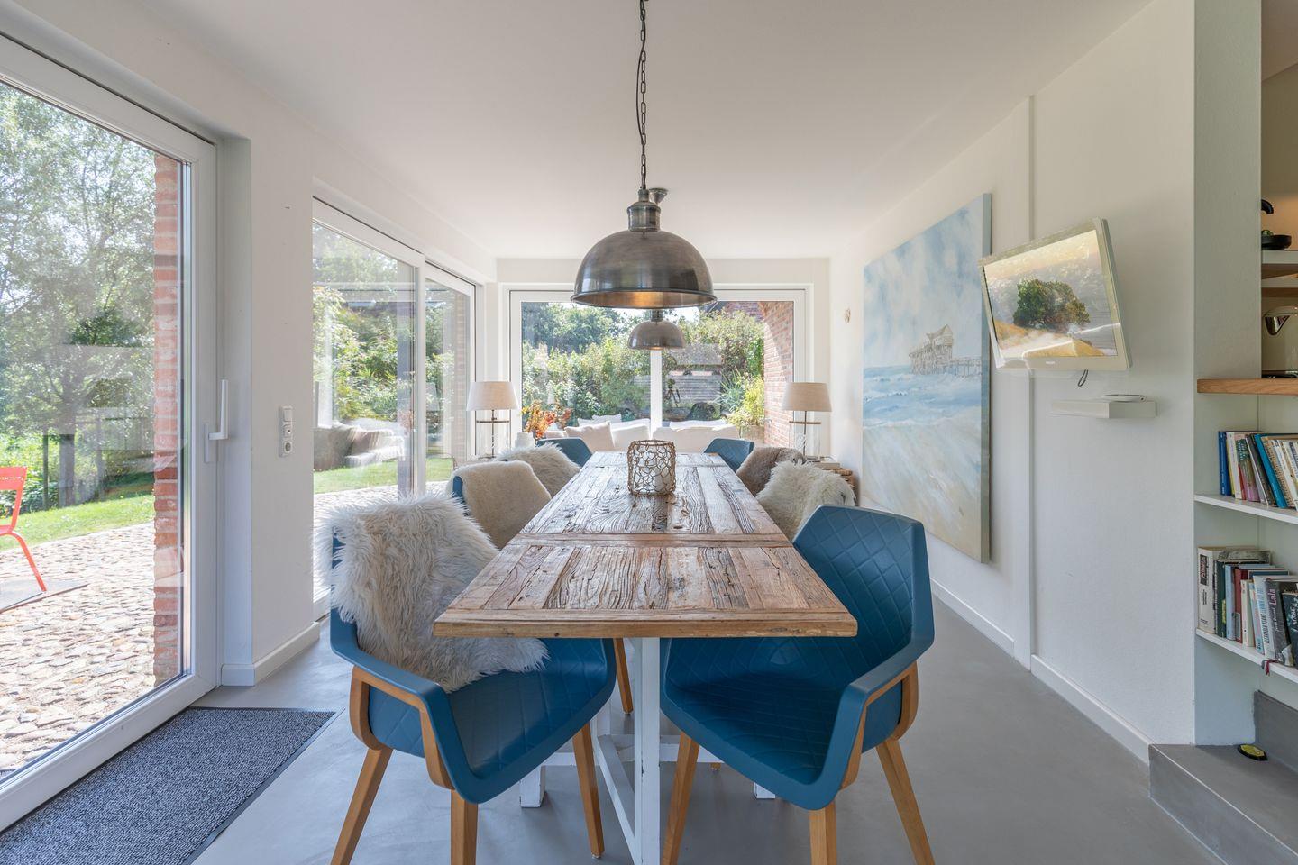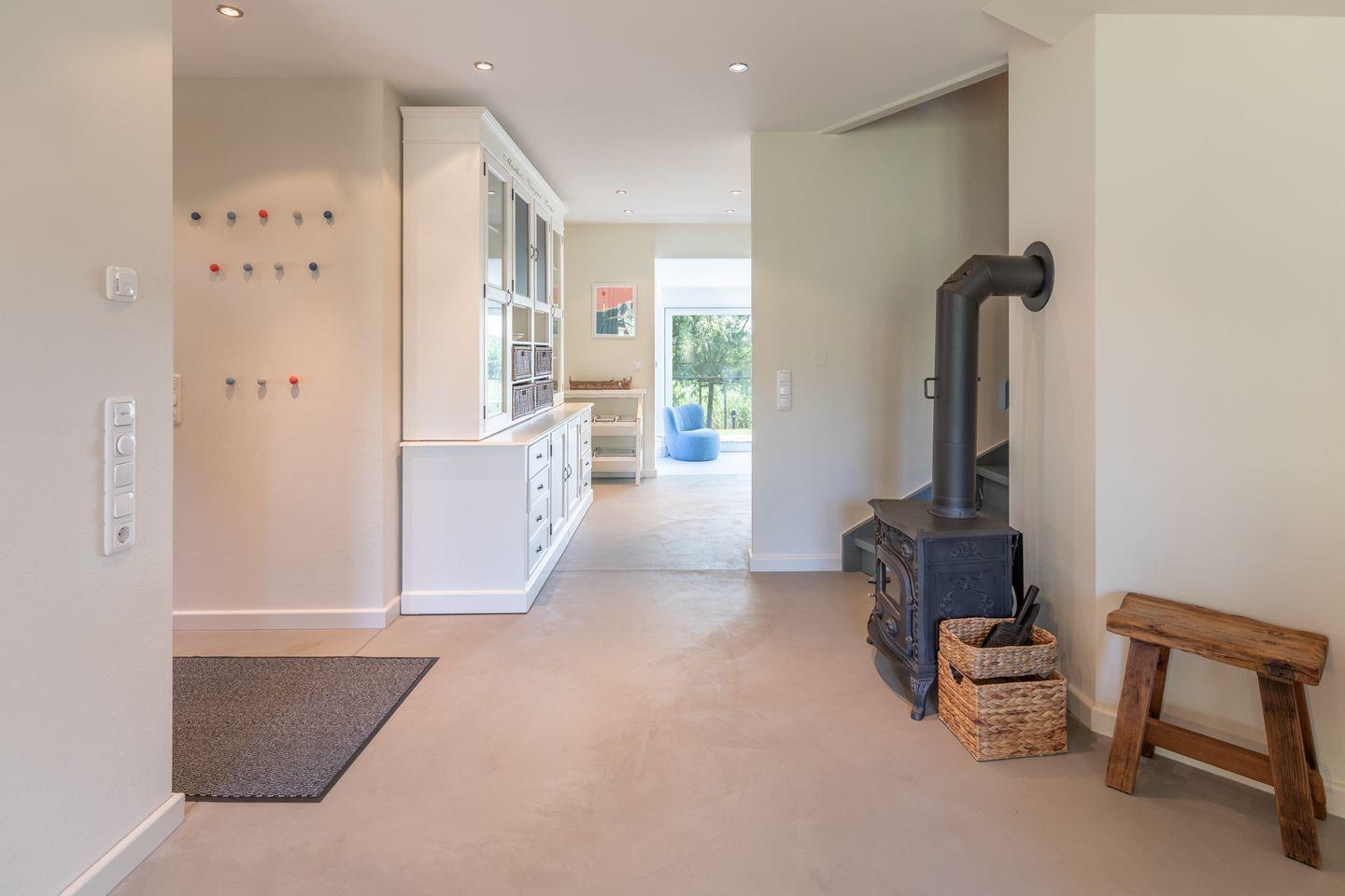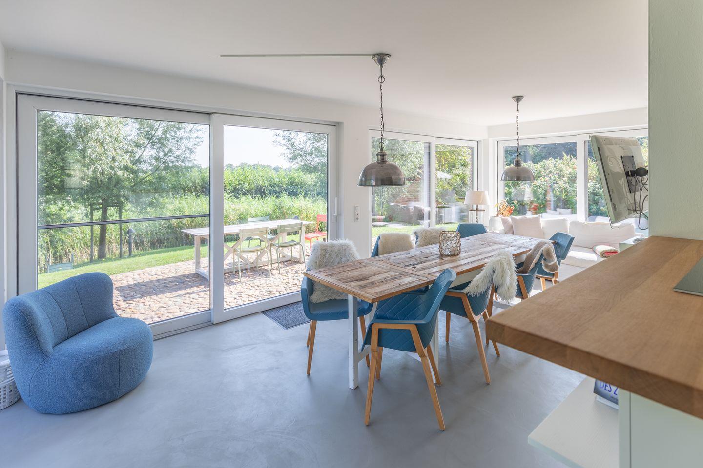 Vom Eingangsbereich mit Garderobe gelangen Sie in den großzügigen Wohn-Essbereich mit offener Küche. Das Raumangebot, die Qualität und umfangreiche Ausstattung der Küche ermöglichen eine gemeinsame Zubereitung der Speisen und geselliges Miteinander. Nehmen Sie Platz am Esstisch im Wintergarten mit Blick ins Grüne und genießen ein ausgiebiges Frühstück mit frischen Brötchen aus der nahegelegenen Dorfbäckerei.