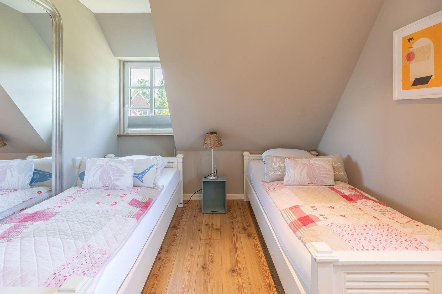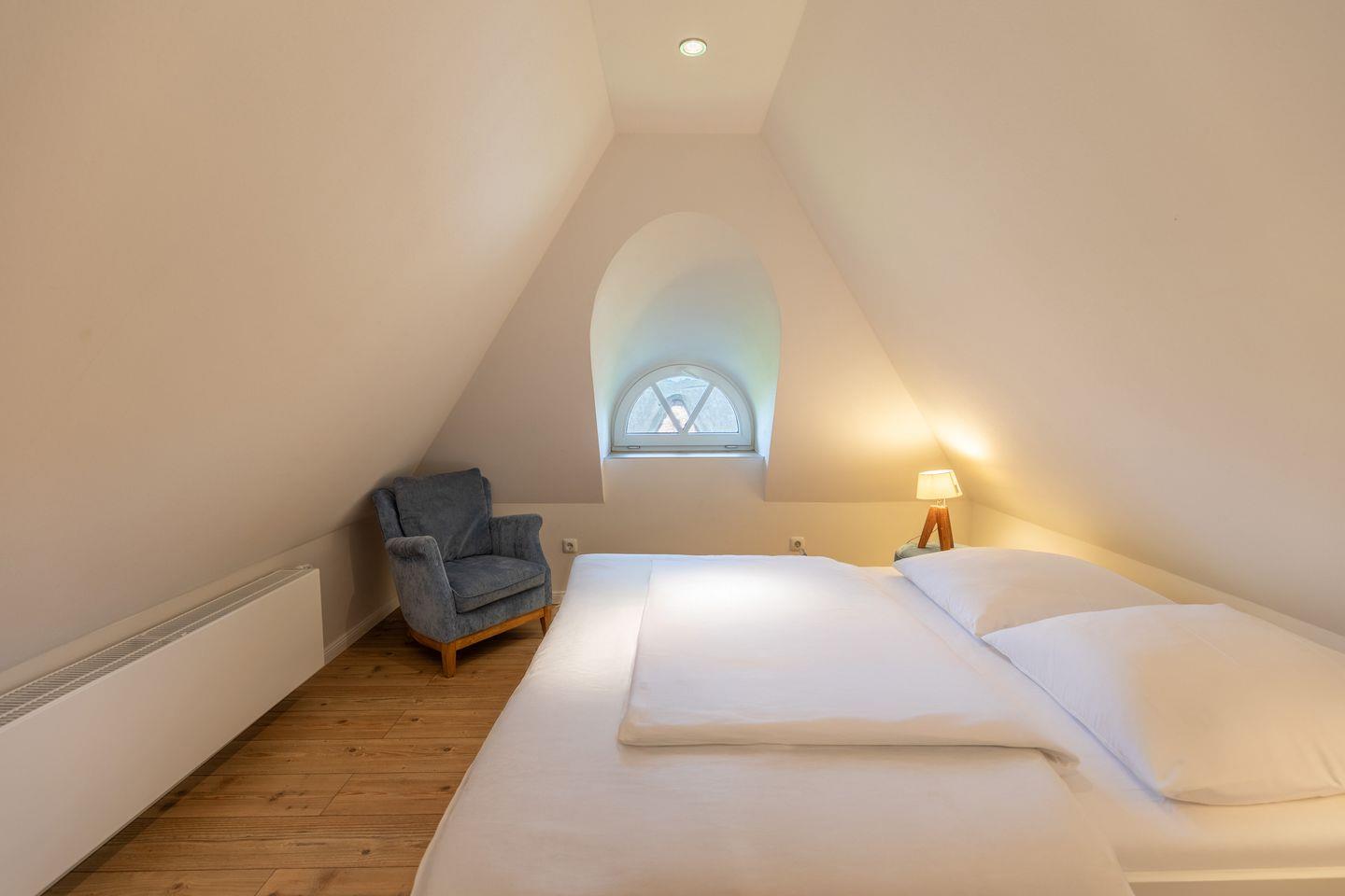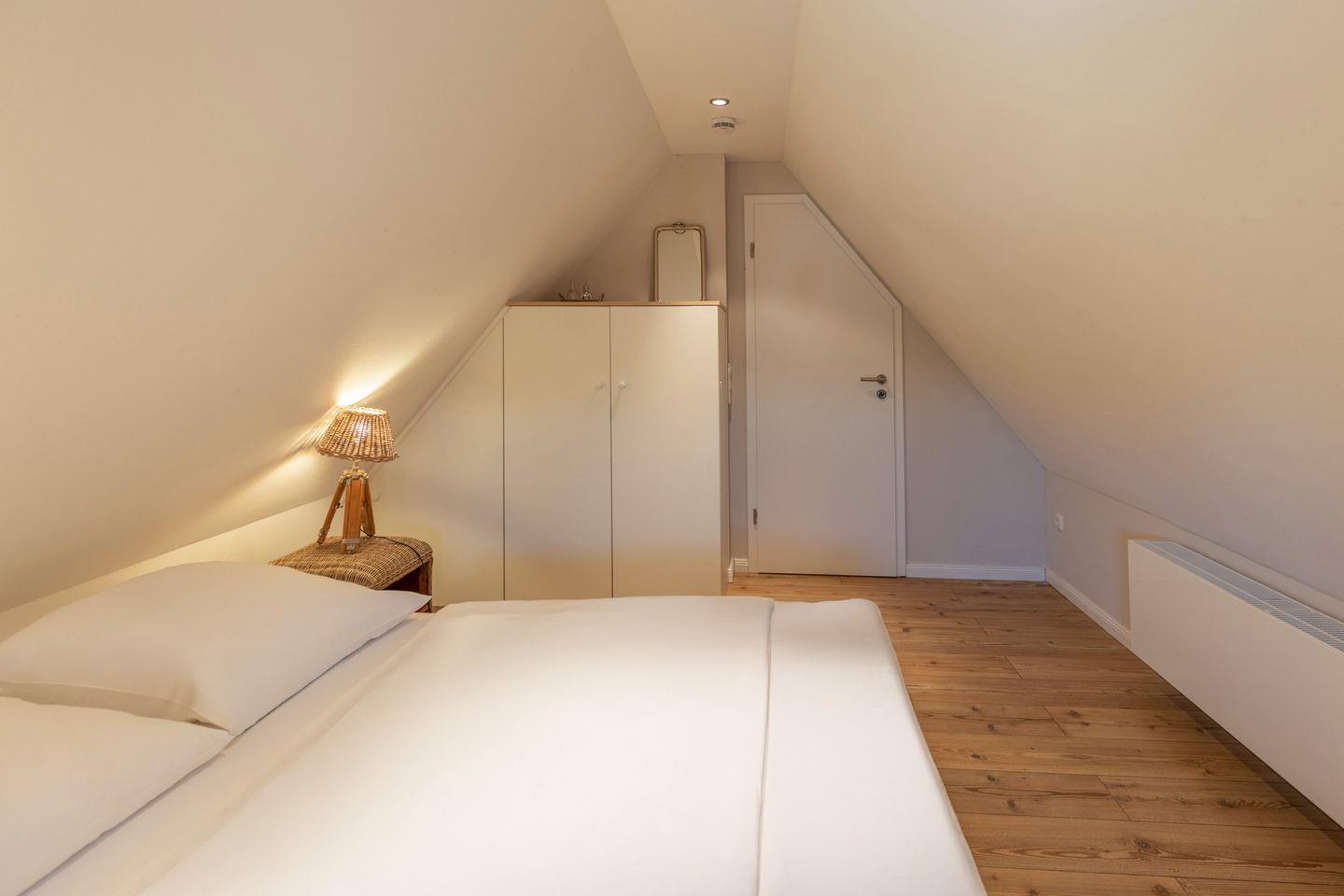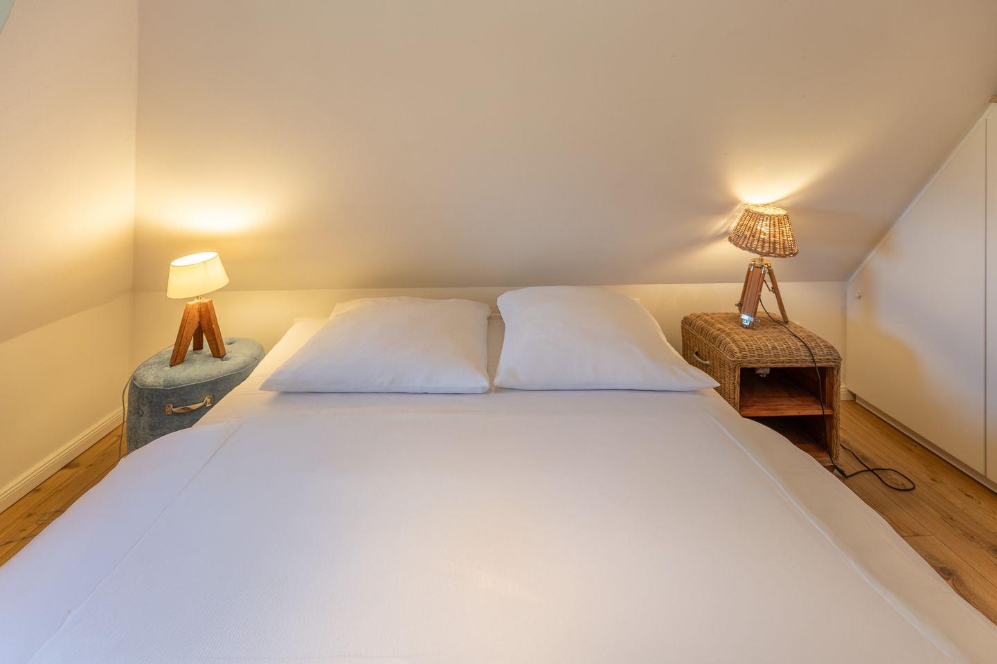 Im ersten Obergeschoss finden Sie ein Schlafzimmer mit Doppelbett (180x200cm, durchgehende Matratze) vor. Zusätzlich gibt es ein weiteres Schlafzimmer mit zwei Einzelbetten (80x190cm). Auf dieser Ebene gelangen Sie auf die Dachterrasse des Hauses, von der aus sich neben romantischen Sonnenuntergängen auch das heimische Wild beobachten lässt. Im zweiten Obergeschoss liegt bei ausreichender Höhe gemütlich im Spitzboden mit Rundbogenfenster das dritte Schlafzimmer mit Doppelbett (160x200cm, durchgehende Matratze).
