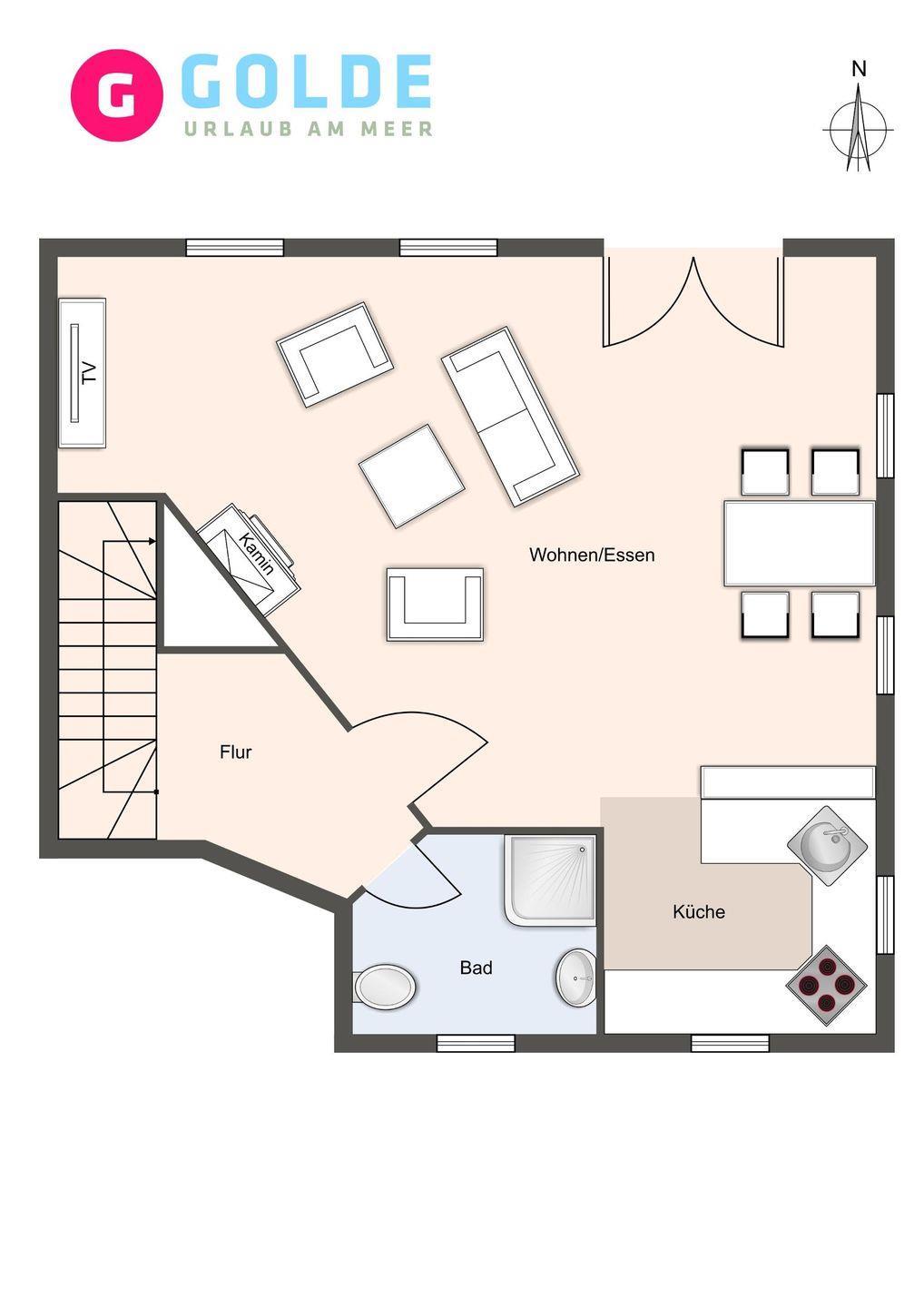 Die Wohnfläche von 93m² verteilt sich auf zwei Ebenen: Erdgeschoss: heller, freundlicher Wohnraum (40 m²) mit offener Küche und Wohn-/Essbereich mit Kamin.