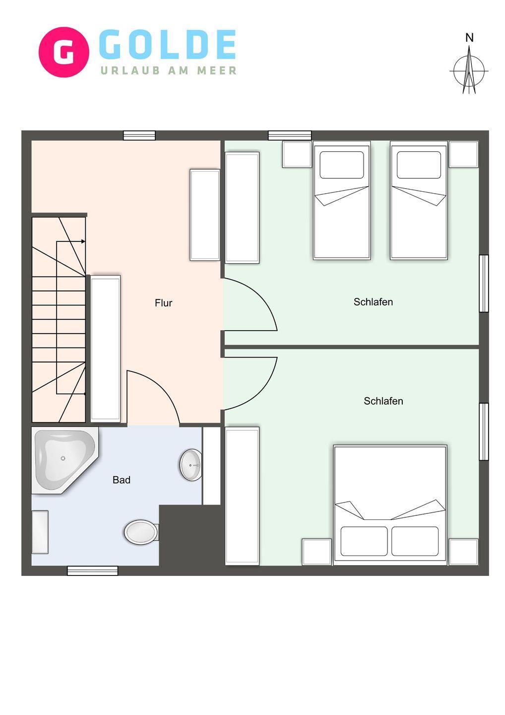 Obergeschoss: zwei gemütliche Schlafzimmer (1 x Doppelbett 180 x 200 cm, 2x Einzelbetten 90 x 200 cm), geräumiges Badezimmer mit Eckbadewanne und Handtuchtrockner.