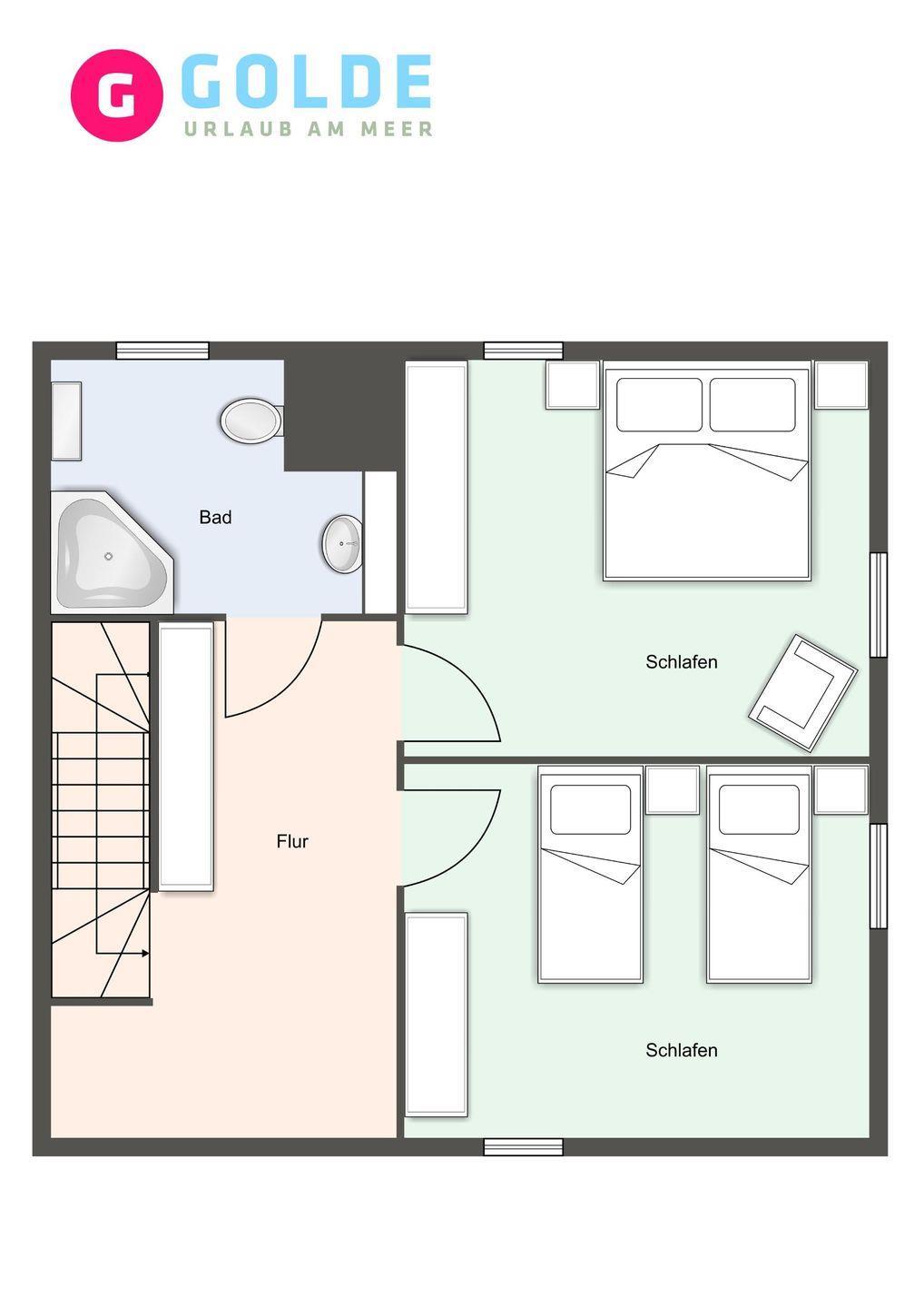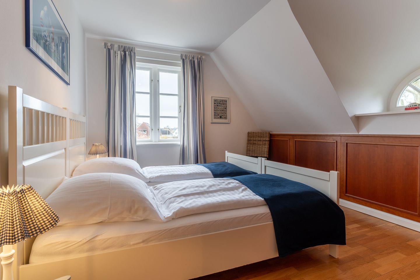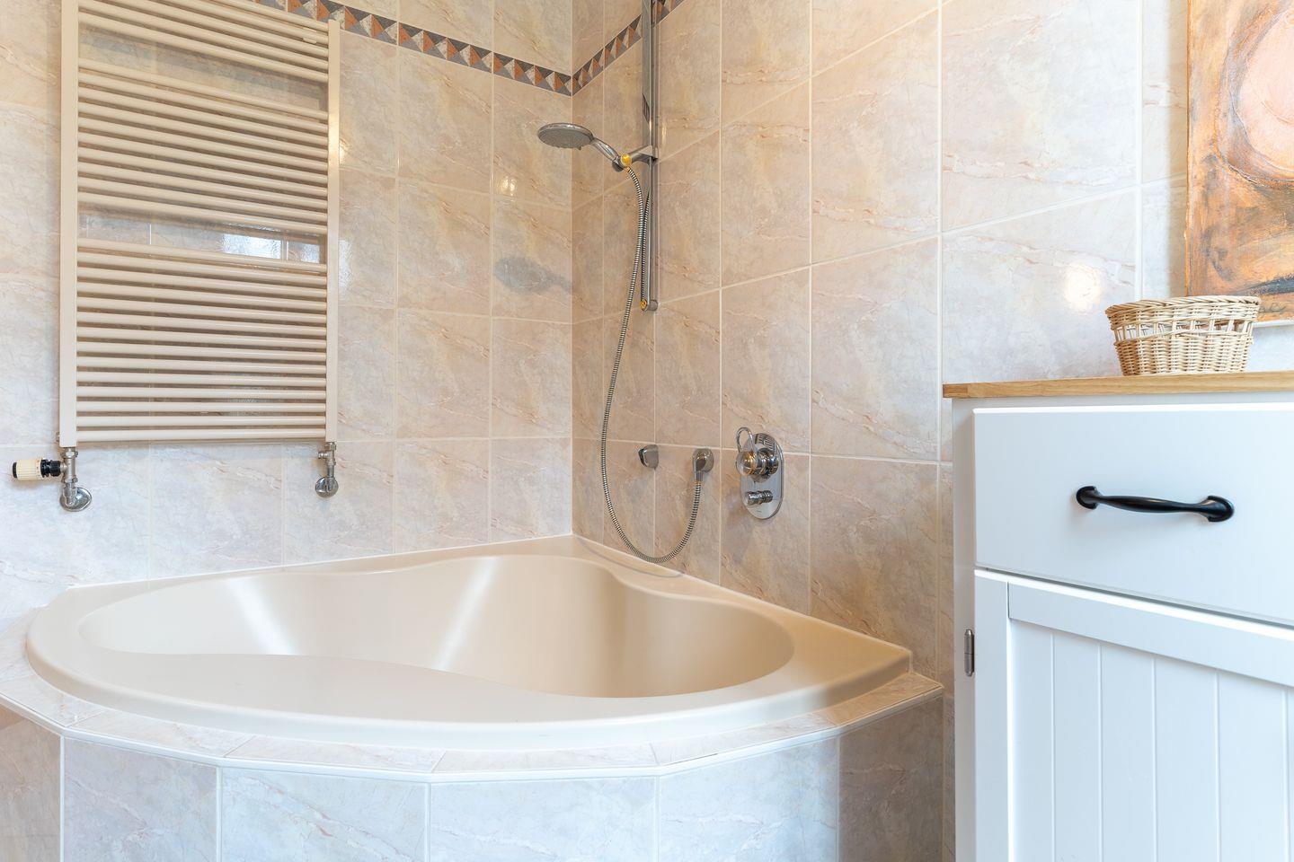 Obergeschoss: zwei gemütliche Schlafzimmer (1 x Doppelbett 180 x 200 cm, 2x Einzelbetten 90 x 200 cm), geräumiges Badezimmer mit Eckbadewanne und Handtuchtrockner.